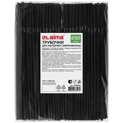 Трубочки для коктейлей гофрированные, пластиковые 5 х 240 мм, черные КОМПЛЕКТ 250 штук, LAIMA, 608359