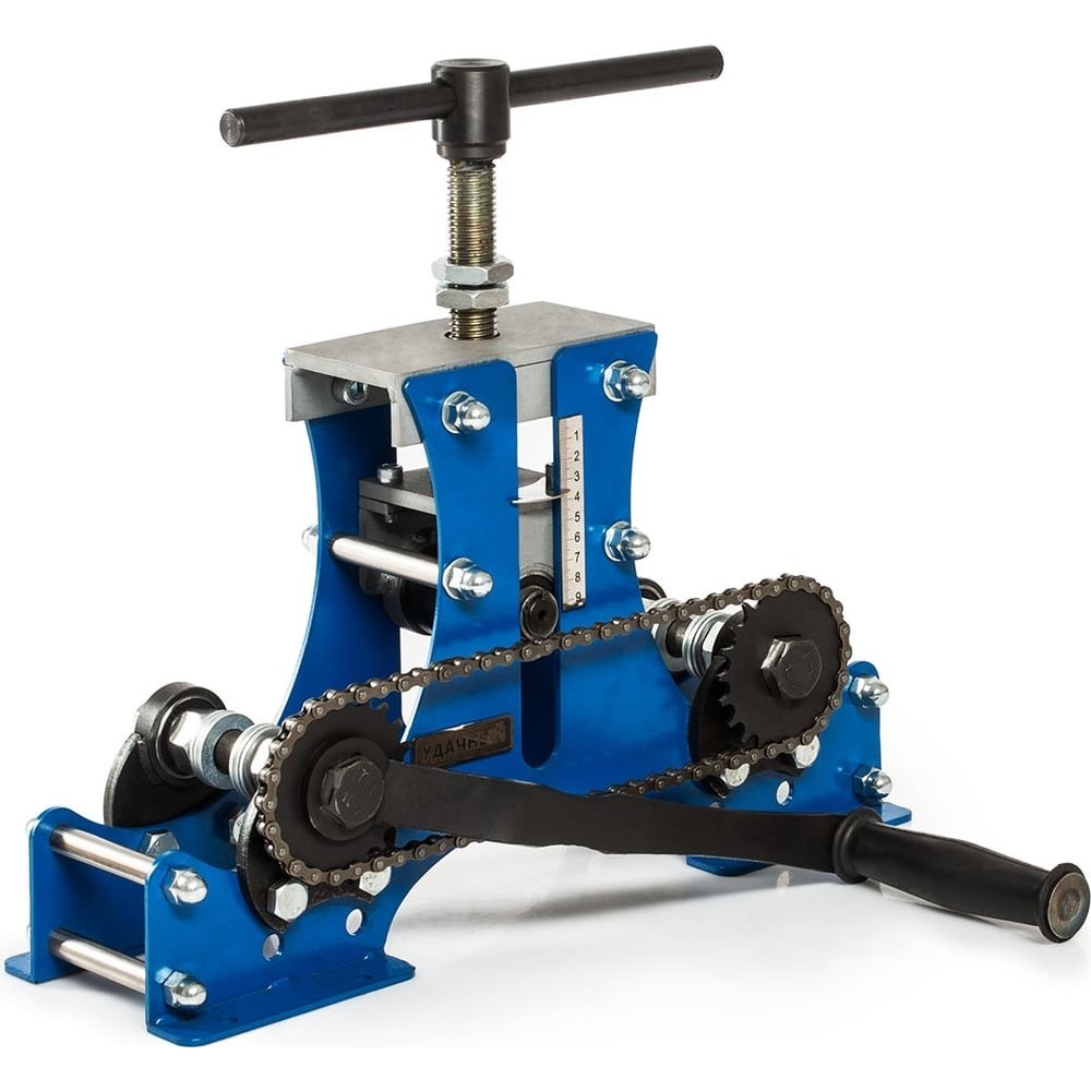Трубогиб "Удачный" - это универсальный трубогиб, который справится с любой задачей.Цепной трубогиб без усилий прокатывает профиль шириной 50-60 мм. Экономьте свои силы и время.В основе "Удачный" - мощная рамная конструкция. Раму трубогиба вырезают лазером из толстого листового металла с точностью до десятых долей миллиметра. Валы трубогиба строго параллельны - он гнет профиль без смещения.Станина "Удачный" - 6 мм. Чтобы достичь такого же результата, трубогибу из швеллеров нужна станина толщиной 10 мм.Класс прочности валов - 10.9. Срок службы трубогиба увеличивается до 15 лет.По своим характеристикам Удачный не имеет конкурентов на рынке.Трубогиб "Удачный" гнет профиль без повреждений, рывков и пробуксовок.Трубогиб "Удачный" покрыт толстым слоем порошковой спецкраски, которая:равномерно покрывает металл без подтеков и наплывов;не смывается водой и растворителем;не остаётся на руках и не слазит после первого использования;не выгорает на солнце.Порошковая краска - полимерное покрытие с высокими защитными свойствами.Удачный надежно защищен от механических повреждений: сколов, царапин и коррозии.Все трубогибы проходят обязательный 3-уровневый контроль ОТК и проверяются на соответствие заявленным характеристикам и внешний вид:Приемка с производства.Приемка на складе.ОТК при отправке клиенту.Все процедуры регламентированы. Брак исключен.профессиональная рама;валы: класс прочности 10.9. Сталь СТ-45;ТВЧ закалка и химическое воронение;цепной привод;центральный вал - бочонок