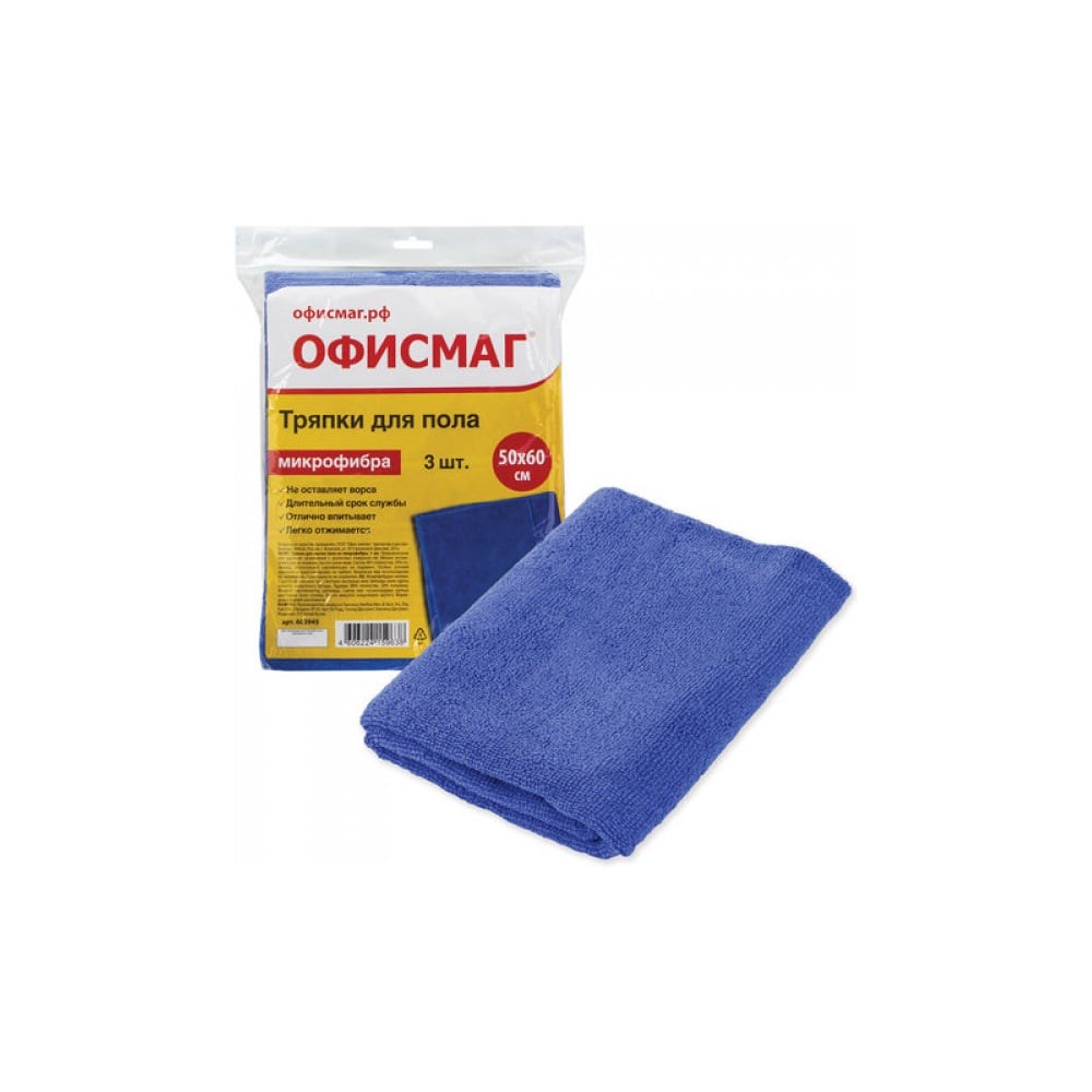 Тряпки для мытья пола ОФИСМАГ комплект 3 шт, микрофибра 50х60 см 603945 бережно чистят и полируют любые поверхности, быстро высыхают, не скатываются, не оставляют волокон и разводов. Благодаря особому строению ткани микрофибра впитывает в 4 раза больше жидкости по сравнению с другими материалами. Долгий срок службы обеспечивает плотность 260 г/м2. Обладает антистатическим эффектом.