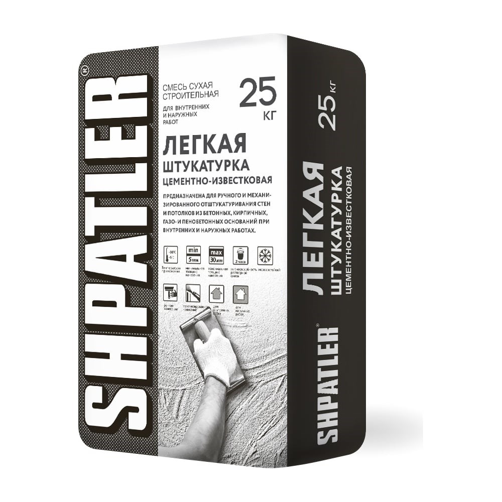 Цементно-известковая штукатурка легкая ШПАТЛЕР 25 кг Ш00010 предназначена для ручного и механизированного отштукатуривания стен и потолков из бетонных, кирпичных, газо- и пенобетонных оснований при внутренних и наружных работах. Цементно-известковая сухая строительная смесь, состоящая из мелкозернистого заполнителя и модифицированная минеральными и полимерными добавками. При смешивании с водой образует пластичную растворную смесь, удобную для нанесения и последующего заглаживания. После затвердевания образует морозостойкий и водостойкий раствор. Рекомендуется как для машинного, так и для ручного нанесения.