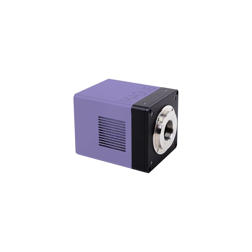 Цифровая камера MAGUS CLM90 разработана для работы в свете люминесценции и по методу темного поля. Камера оснащена сенсором 7,1 Мпикс и формирует реалистичное изображение в разрешении 3200x2200 пикс. Камера рекомендуется для работы с объективами 4х, 10х, 20х и 40х. При работе с объективами малого увеличения камера позволит различить больше мелких деталей. Видеозапись ведется с частотой 51,3 или 133,8 кадров в секунду в зависимости от разрешения. Видео плавные, с мягкими и незаметными глазу переходами между кадрами. Передвижение препарата отображается в реальном времени, без задержек. Камера обеспечивает удобную работу с подвижными объектами, подходит для проведения демонстраций в аудитории. Камера оснащена интерфейсом USB 3.0. Скорость передачи данных в 10 раз выше, чем у камер с интерфейсом USB 2.0. Высокоскоростная камера рекомендуется для профессиональной работы в лаборатории, исследований или обучения в вузах. Сенсор В камере установлен монохромный CMOS-сенсор SONY Exmor с обратной засветкой. Эта технология повышает светочувствительность и улучшает производительность камеры при слабой освещенности. Монохромный сенсор не дает классифицировать объект исследования по цвету, но обладает в 2–4 раза большей светочувствительностью, чем цветной. Изображение получается более ярким и контрастным, поэтому монохромная камера подходит для решения задач, связанных с низкой освещенностью. Сенсор большого размера – 1,1''. Физический размер сенсора влияет на качество получаемого изображения: чем он больше, тем чище изображение, больше глубина цвета, шире поле зрения. Пиксель размером 4,5x4,5 мкм обеспечивает светочувствительность 3354 при 1/30 с. Чтобы обеспечить максимальное поле зрения без искажений, рекомендуется адаптер с увеличением 1х. Элемент Пельтье Во время длительной работы сенсор камеры сильно нагревается. Из-за этого в изображении возникает тепловой шум, значительно снижающий качество изображения. Для устранения этого негативного эффекта камера оснащена двухступенчатым термоэлектрическим модулем (элементом Пельтье). Он устанавливает температуру на 42 °C ниже комнатной и создает оптимальные условия для длительной работы сенсора без нагрева, поэтому камера подходит для фотографирования на длинных выдержках: изображение ясное, без теплового шума. Затвор Камера оснащена глобальным затвором. Сигнал считывается со всех светочувствительных элементов матрицы одновременно. Быстродвижущиеся объекты видны четко и без ложных оптических эффектов. Изображение при слабой освещенности яркое и информативное, что особо важно для люминесценции. Программные возможности Камера использует программное обеспечение для вывода картинки на внешний экран, фотографирования, видеозаписи, редактирования изображения, определения линейных и угловых размеров объектов и их структур. Перед измерениями программное обеспечение необходимо откалибровать на каждом объективе с помощью калибровочного слайда. Установка Камера устанавливается на микроскоп в канал визуализации при помощи адаптера C-mount из комплекта поставки микроскопа.