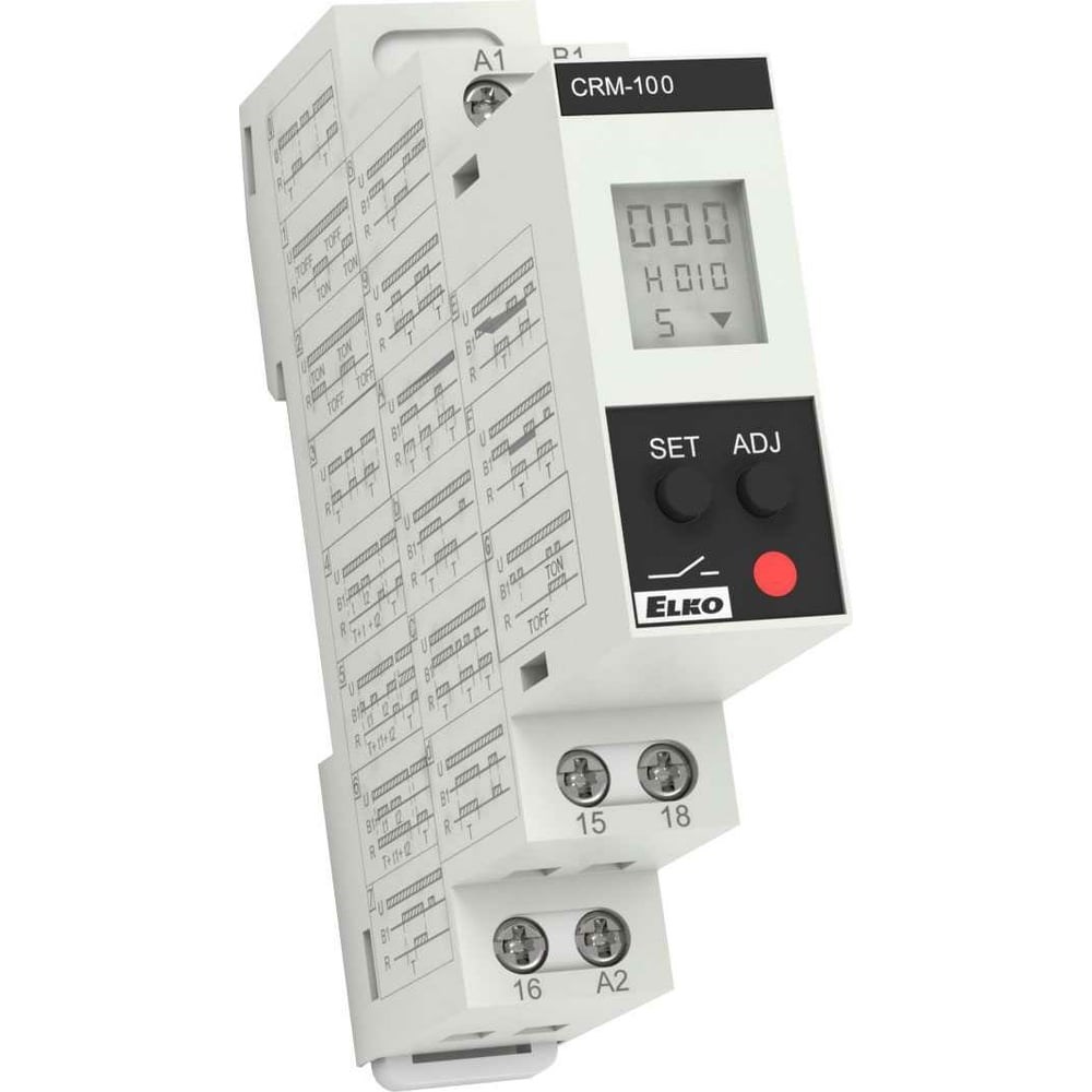 Дополнительные технические характеристики цифрового реле времени ELKO CRM-100 17 функций, точное отображение и настройка времени на дисплее, AC/DC 24-240V EP УТ000011564: 17 функций: - 4 временные функции управления напряжением питания - 13 временных функций, управляемых управляющим контактом Точная регулировка и отображение времени на дисплее (допускается толерантность элементов с механической регулировкой). Диапазон времени 0.1 с – 999 часов. Наглядное отображение временных функций на дисплее. Защита IP30 со стороны лицевой панели/ IP20 клеммы.