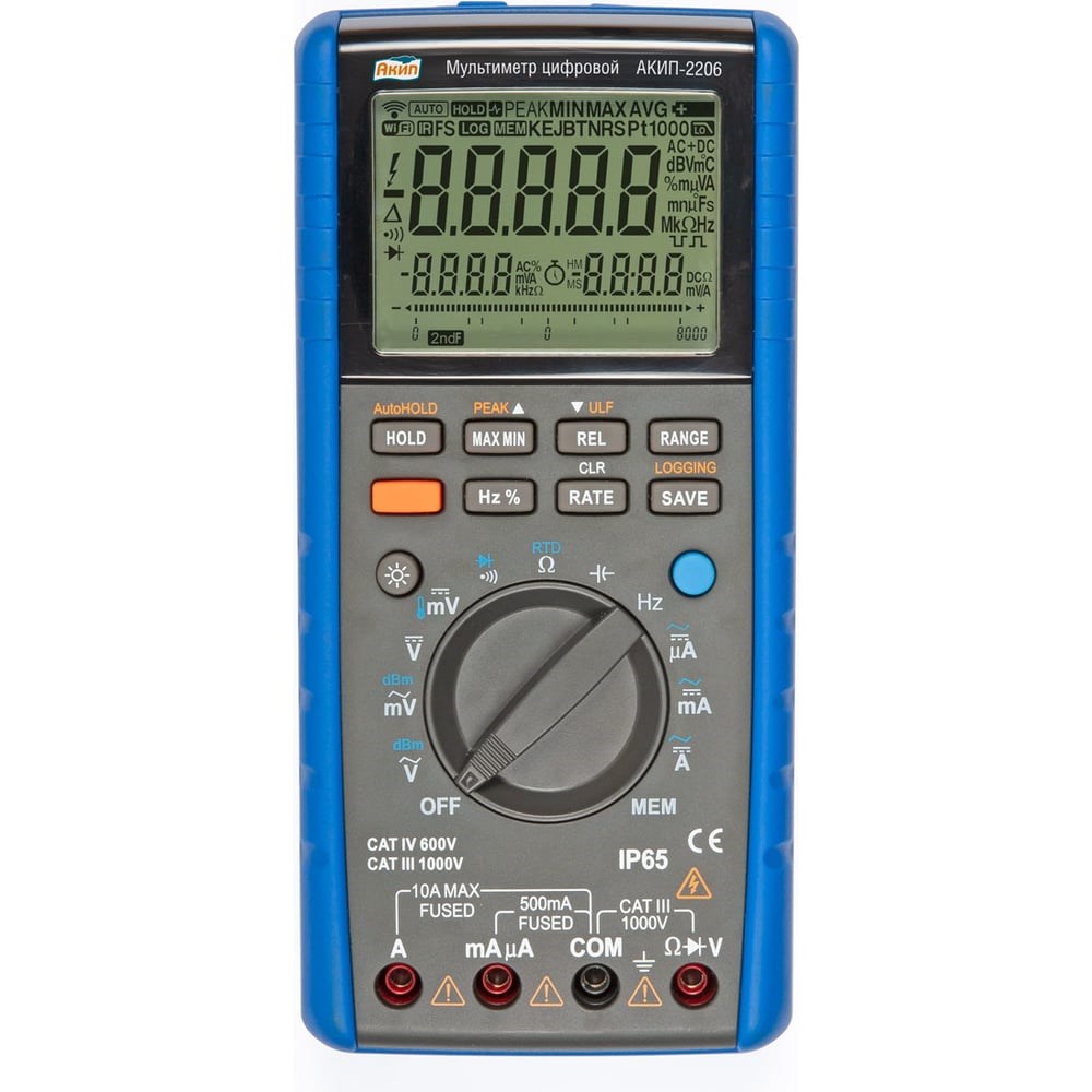 Мультиметр цифровой АКИП-2206 Прецизионный мультиметр АКИП-2206 характеризуется следующей функциональностью и измерительными ресурсами: переменное (AC, AC+DC) и постоянное напряжение, переменный и постоянный ток (до 10 А), частота, ёмкость, сопротивление, проверка целостности цепи (прозвонка), испытание p-n переходов, измерение уровня сигнала (дБ/ дБм) и температуры термопарой К-типа, а также с помощью термометра сопротивления типа Pt100. Выбор предела измерений: ручной (Range) или автоматический (AUTO) Отдельный вход «mA, μА» для слаботочных измерений (0…500 мА) Память (2000 ячеек): 1000 результатов (экран. инф./SAVE), 1000 отсчётов (регистратор/ LOGG) Регистрация пиковых значений пост. напряжения/ тока (PEAK- DVC/ DCA ) Измерение Max/ Min/ AVG значений, относительные измерения REL (∆, %) Функция АвтоУдержание (AutoHold), регистрация пиковых значений (от 1 мс) ЖК-индикатор (5.500/55.000), 20 изм./с (основная шкала), 2 доп. области индикации Графическая линейная шкала (51 сегмент, 24 изм/с), подсветка дисплея Интерфейс: USB (оптический), в комплекте ПО (DMMVIEW_H-CD software) Батарейное питание, индикация ресурса питания, автовыключение Безопасность: кат.IV 600 В/ кат.III 1000 В Класс исполнения: IP65