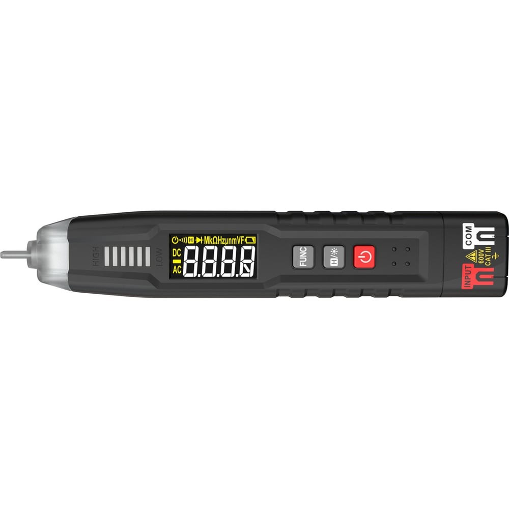 Ermenrich Zing TC12 - многофункциональный карманный мультиметр для измерения целого ряда электротехнических величин: постоянного и переменного напряжения, частоты, емкости и сопротивления. Кроме того, с помощью этого тестера определяют обрыв проводника, короткое замыкание, пробой или обрыв диода. Но это еще не все: Ermenrich Zing TC12 помогает обнаружить скрытую проводку в полу или в стене, определить фазу и последовательность фаз в трехфазной сети. И все эти возможности предоставляет прибор размером с авторучку! Мультиметр можно использовать дома при ремонте электропроводки. Оценят его и профессиональные электрики, которым нужен легкий, но при этом функциональный рабочий инструмент.Переменные величины рассчитываются по среднеквадратичному значению (метод True RMS) с высокой достоверностью. Режим работы выбирается вручную с помощью специальной кнопки на корпусе мультиметра. При измерении постоянного и переменного напряжения, сопротивления, а также при прозвонке кабеля рекомендуется использовать функцию Smart. В этом случае измерение осуществляется автоматически, в зависимости от типа входящего сигнала. Результат измерения можно зафиксировать на дисплее, чтобы посмотреть его позднее. Для работы ночью предусмотрен встроенный светодиодный фонарик.Питание прибора осуществляется от 2 батареек типа AAA, уровень заряда визуализируется на дисплее. Если тестер определенное время не используется, то он автоматически отключается.