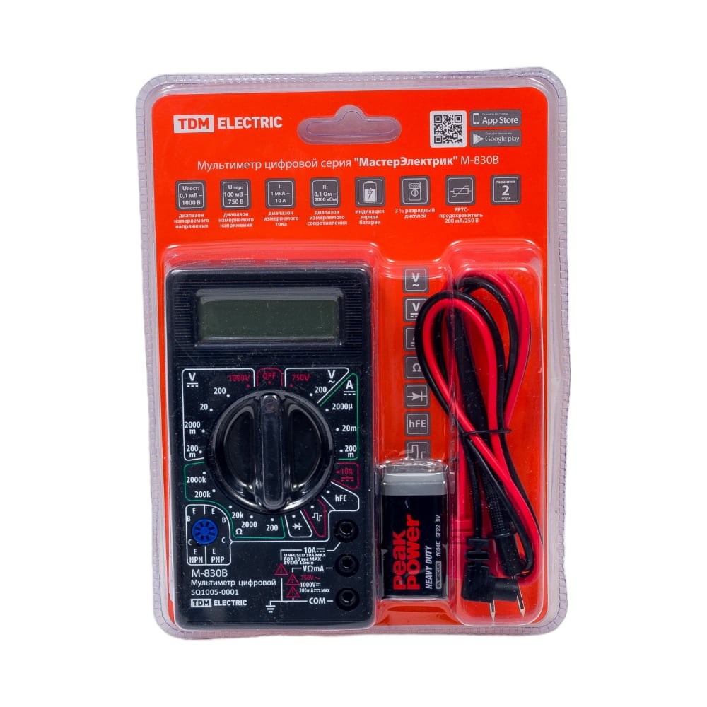 Цифровой мультиметр TDM МастерЭлектрик М-830В SQ1005-0001 надежен в работе. С его помощью легко измерить напряжение, силу постоянного тока, сопротивление в электроцепи. Дисплей с крупными цифрами упрощает считывание данных. Корпус прибора сделан из негорючего пластика. Предусмотрена защита от перегрузок по току с помощью предохранителя 250мА/250В.
