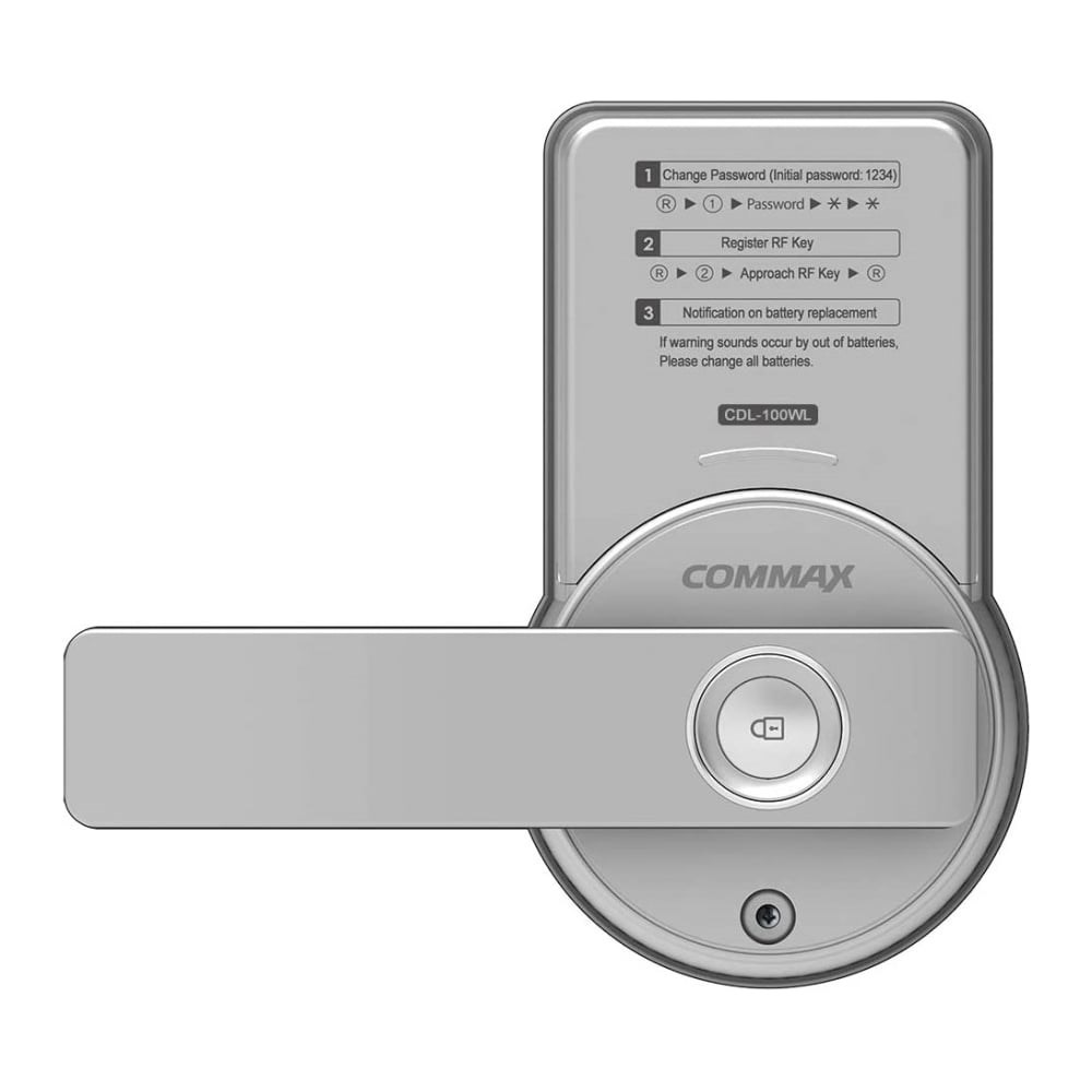 Цифровой замок COMMAX CDL-100WL – автономное устройство, предназначенное для установки на входные или межкомнатные двери. Благодаря наличию функции "автозапирания двери" отпадает потребность задерживаться на выходе из дома. Открыть замок возможно с помощью смарт-ключа, отпечатка пальца или цифрового пароля. Устройство работает от четырех батареек типа АА 1.5V.