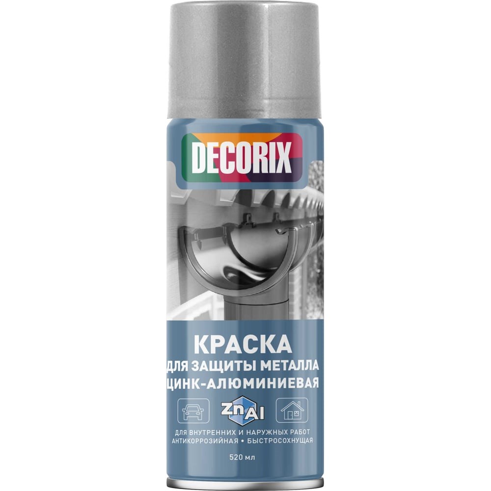 Аэрозольная краска для защиты металла цинк-алюминиевая, 520 мл Decorix 0114-04 DX предназначена для защиты от коррозии и декоративного окрашивания металлических поверхностей, в том числе оцинкованных поверхностей и алюминия, при бытовом применении, декоративно-оформительских работах, строительстве и ремонте. Применяется для окрашивания и антикоррозийной обработки металлических изделий и конструкций, крыш, водосточных труб, наружных отливов, оград, швов стальных конструкций, консервации поверхностей и т. п. Аэрозольная эмаль удобна для окрашивания небольших поверхностей и труднодоступных мест. Краска образует матовое металлизированное покрытие с высокими антикоррозионными свойствами.