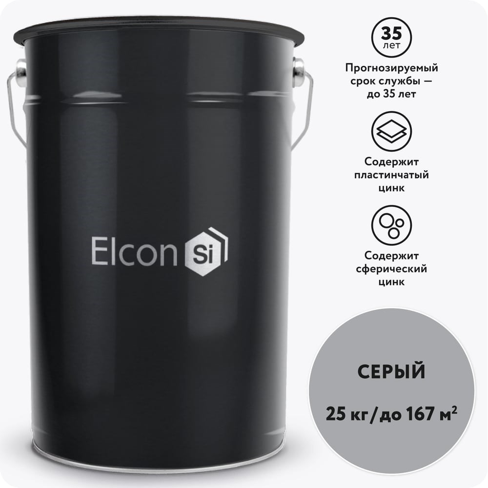 Противокоррозионная цинковая грунтовка Elcon Zintech, 25 кг 00-00003953 Состав для холодного цинкования Elcon Zintech—это цинконаполненная краска с уникальной формулой на основе двух типов цинка. Данный цинковый грунт обеспечивает протекторную защиту черных металлов и может использоваться как самостоятельное покрытие (цинковая эмаль) или как цинкосодержащая грунтовка под декоративные покрытия. Краска для холодного цинкования отличается низким расходом и повышенной устойчивостью к атмосферным воздействиям.Свойства:• Универсальность применения:Цинконаполненный грунт может использоваться как самостоятельное покрытие (цинковая краска по металлу) или как основа под дальнейшую окраску.• Отсутствие белой коррозии:Пластинчатый цинк предотвращает появление "белой ржавчины**, что позволяет использовать краску с цинком без обязательного нанесения покрывных эмалей.• Экономичный расход:Плотность 1,7 г/см³ обеспечивает низкий расход по сравнению с традиционными цинкосодержащими красками.• Преимущества двух цинков:Сферический цинк придает покрытию твердость, пластинчатый—эластичность и барьерные свойства.• Долговечность покрытия:Цинковая краска выдерживает более 1440 часов в камере солевого тумана без признаков коррозии.Области применения:Строительные металлоконструкции:каркасы зданий,опоры ЛЭППромышленное оборудование:резервуары,трубопроводыИнфраструктурные объектыСпециальные применения:нефтегазовое оборудование,энергетические объекты