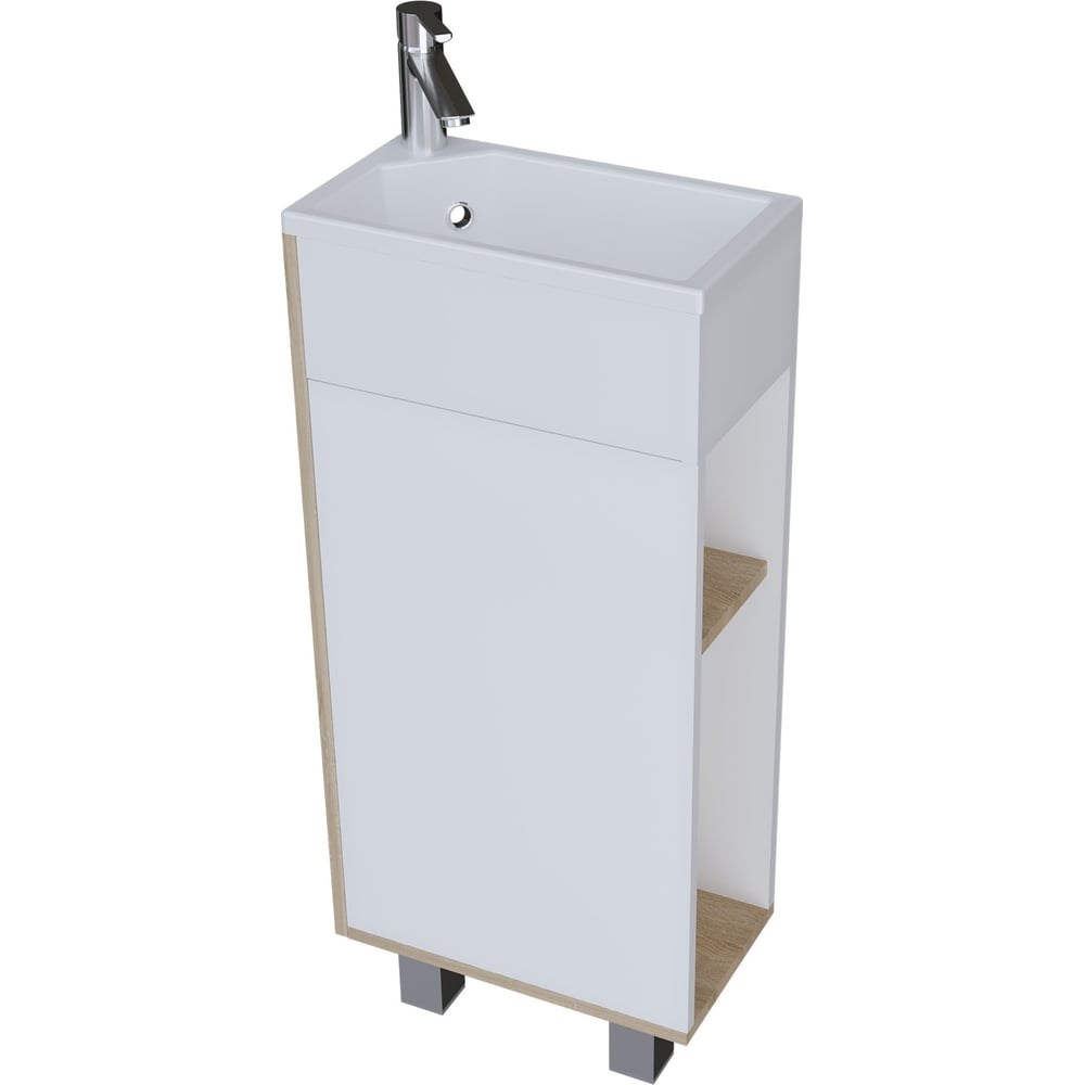 Тумба с раковиной в ванную 1Marka Laura 40 см Напольная/Подвесная цвет Дуб Сонома Левая У85930 - это компактная и функциональная мебель, которая станет отличным решением для гостевого санузла или маленькой ванной комнаты. Тумба выполнена в современном минималистичном стиле, который характеризуется правильными геометрическими формами, рациональностью и эргономичностью. Отсутствие ручек на фасаде позволяет создать цельный и легкий образ, не утяжеленный фурнитурой. Мебель изготовлена из высококачественных материалов: корпус из ЛДСП, фасад из МДФ, а раковина из полимерной керамики. В комплекте идут демпферы и дверные петли с доводчиками, обеспечивающие бесшумное и мягкое закрывание. Тумба имеет размеры 39х22х85 см, что позволяет ей гармонично вписаться в любой интерьер. Цвет изделия - светлый дуб, что делает его актуальным для любого современного дизайна. Тумба Laura 40Н 1д. Дуб Сонома L оснащена раковиной из полимерной керамики, что обеспечивает бережливую повседневную эксплуатацию. В комплект также входят сифон, гофрированная трубка и комплект фурнитуры. Выбирая эту модель, вы получаете стильную, функциональную и надежную мебель для вашей ванной комнаты.