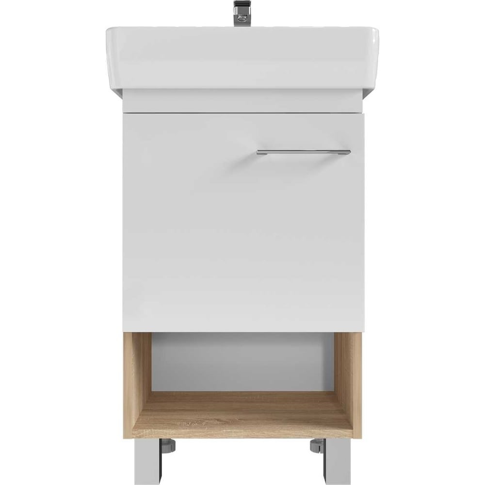 Напольная белая глянцевая тумба для ванной Tera – универсальное решение для небольших планировок. Современная минималистичная модель будет гармонична в различных стилях. • Текстурный деревянный корпус тумбы добавляет теплые природные оттенки в ванную комнату. • Материал - МДФ, облицованный влагостойкой пленкой ПВХ. Благодаря этому тумба надолго сохранит первозданный вид. • Модель отличается универсальностью: может использоваться как напольный, так и подвесной элемент интерьера. • Несмотря на небольшие габариты модели, она очень функциональна. В открытой полке тумбы удобно хранить органайзеры с необходимыми принадлежностями. А в закрытой – бытовую химию. • Надежная немецкая фурнитура: рассчитана на 30 000+ открытий. Петли оснащены доводчиками, что обеспечивает мягкое закрывание дверей. Тумба под раковину для ванной Tera – это удобство, стиль и компактность в одной модели. Универсальный дизайн, цвет и функциональность будет радовать вас годами. Сочетание зеркала и тумбы Tera является готовым решением для ванной комнаты, которое сможет сэкономит ваше время на поиски.Внимание! Раковина в комплект поставки не входит и приобретается отдельно.К данной тумбе отдельно можно приобрести:Умывальник "НЕО-60" - Арт.У69478