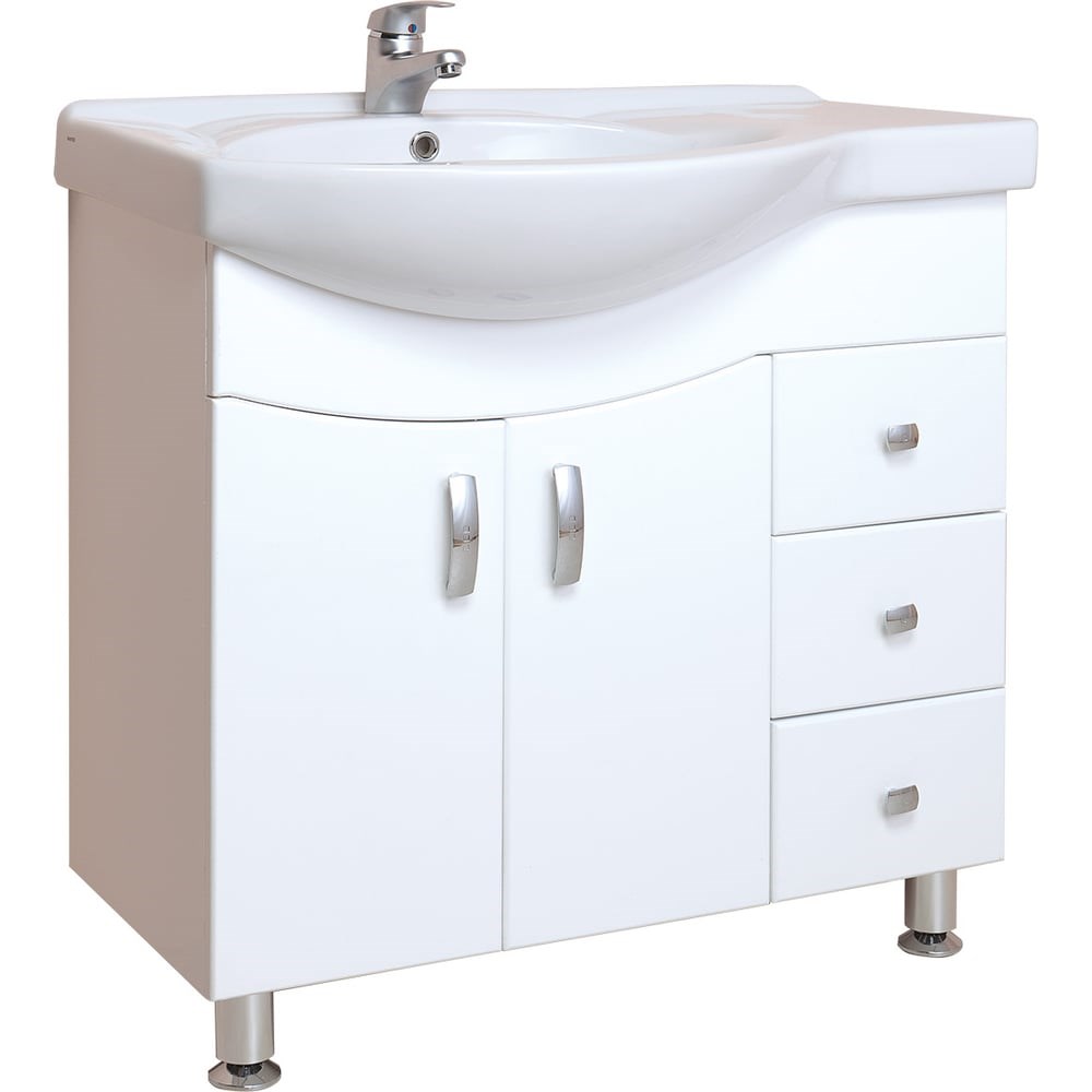 В тумбе Onika Эльбрус 82 белоснежный глянец фасада подчеркивается оригинальной хромированной фурнитурой и сложной изысканной геометрией линий. Современный функционал тумбы позволяет удобно расположить все необходимое: две распашных двери слева скрывают большое отделение для крупных предметов, а три выдвижных ящика справа созданы для хранения небольших вещей. Ящики тумбы оснащены направляющими полного выдвижения, а дверцы снабжены системой плавного закрывания. Корпус тумбы выполнен из ЛДСП, фасад - из ЛМДФ в пленке, устойчивых к механическим воздействиям, перепадам температур и высокой влажности. Пять хромированных ручек и четыре ножки (2 декоративных хромированных и 2 пластиковых) идут в комплекте с тумбой. Размеры тумбы без учета раковины и ножек: 80x37x68 cм. Размеры тумбы с учетом раковины и ножек: 83х51,5х83 см. Совместимая раковина - Santek Коралл 83 (крыло справа).