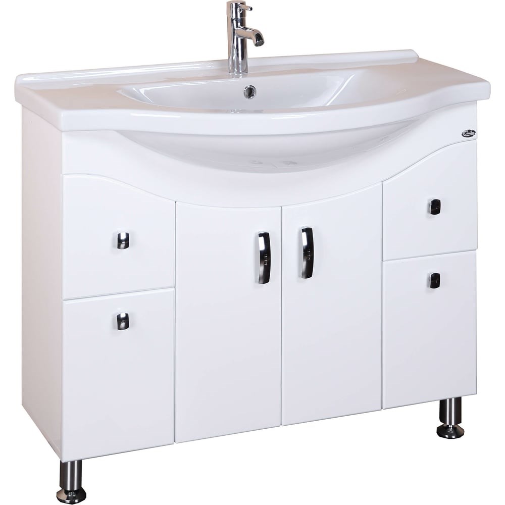 Тумба с раковиной Onika ЭЛЬБРУС 90.13 109016 - белоснежный глянец фасада подчеркивается оригинальной хромированной фурнитурой и сложной изысканной геометрией линий. Современный функционал и огромное внутреннее пространство тумбы позволяет удобно расположить все необходимое: по центру тумбы 2 распашных двери скрывают большое отделение для крупных предметов, а по бокам 2 ниши за распашными дверцами и 2 выдвижных ящика созданы для хранения небольших вещей. Ящики тумбы оснащены направляющими полного выдвижения, а дверцы снабжены системой плавного закрывания. Корпус тумбы выполнен из ЛДСП, фасад - из МДФ в пленке, устойчивых к механическим воздействиям, перепадам температур и высокой влажности. Шесть хромированных ручек и пять ножек (2 декоративных хромированных и 3 пластиковых) идут в комплекте с тумбой.