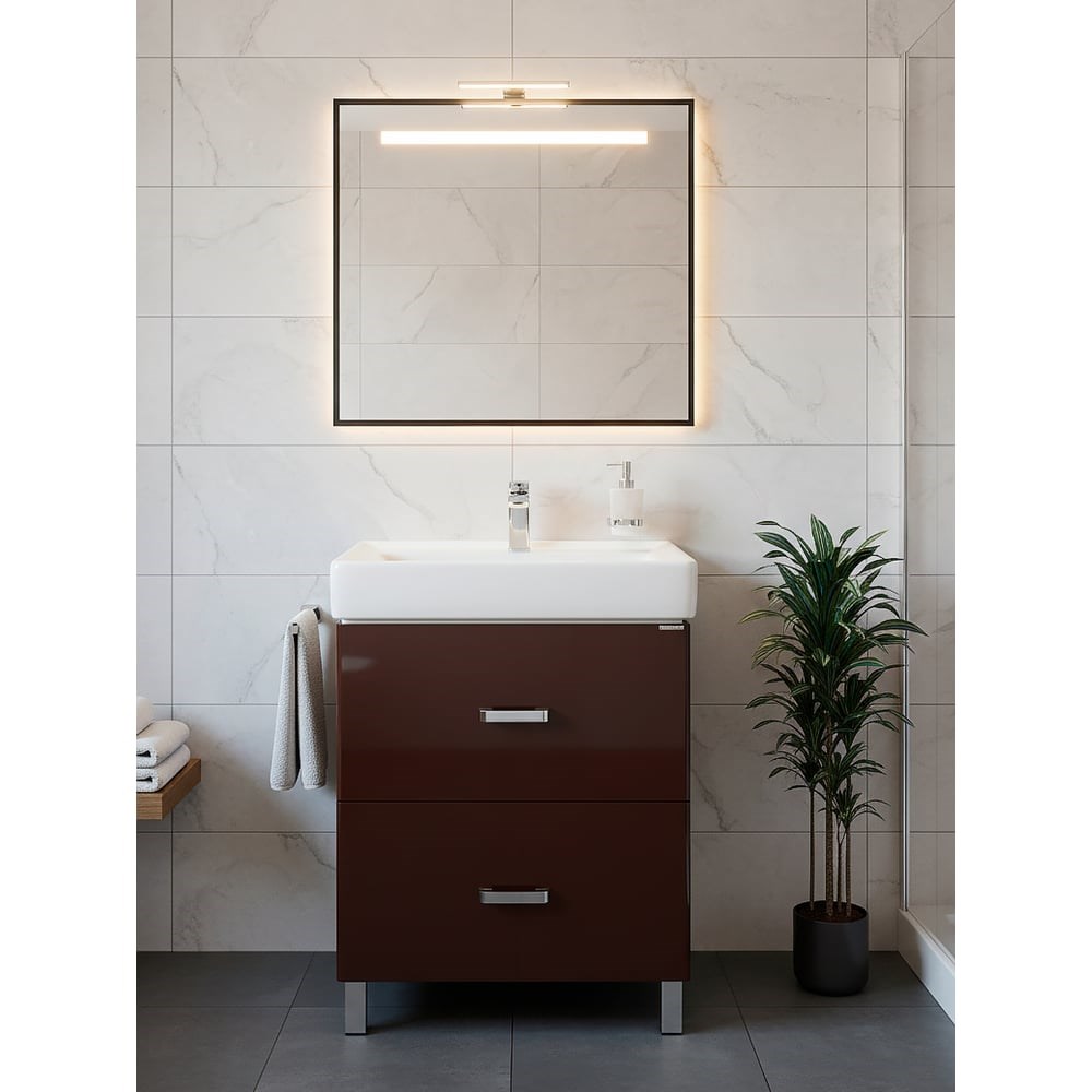 AQUATON Америна 60 H — тумба (темно‑коричневая, 1A169201AM430)Нежная лаконичность и практичность в одном предметe мебели. AQUATON Америна 60 H — современная тумба шириной 60 см, которая сделает вашу ванную комнату аккуратной, уютной и удобной в повседневном использовании.Коротко о главномШирина: 60 смДва внешних ящика и один встроенный отсекКорпус — влагостойкая ЛДСП; фасады — МДФУстановка на ножки, нижнее подключение трубНаправляющие нижнего крепежа и встроенные доводчики — жесткость, надежность и бесшумное закрытиеПокрытие — полиэфирная краска с УФ‑отверждением для дополнительной защиты от влагиРекомендуемая раковина: Santek Тигода 60Почему выбирают эту тумбуПростота и стиль Современный минимализм без лишних деталей: ровные фасады, глубокий глянец и строгие линииНадежность конструкции Корпус из влагостойкой ЛДСП выдерживает условия влажного помещения, а фасады из МДФ обеспечивают ровную и презентабельную поверхность.Комфорт в использовании Направляющие нижнего крепежа фиксируют ящики жестко и равномерно, встроенные доводчики обеспечивают мягкое и бесшумное закрываниеУдобство монтажа и подключения Тумба устанавливается на ножки. Нижняя организация подключения труб делает монтаж сантехники аккуратным и аккумулирует пространство внутри тумбы.Простая инструкция по выбору раковиныПодберите раковину шириной ~60 см — оптимально будет сочетание с Santek Тигода 60, которая повторит пропорции тумбы и обеспечит удобное использование столешницы и ящиков.