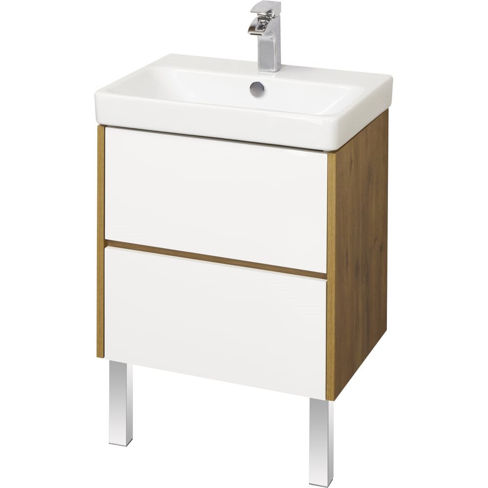 Тумба под раковину Акватон Сканди 55 белая, дуб рустикальный 1A251701SDZ90 выполнена в популярном минималистичном скандинавском стиле. Корпус тумбы выполнен из влагостойкой ЛДСП в декоре натурального дерева, а фасады в белой глянцевой покраске. Конструктивно тумба состоит из 2 вместительных ящиков, установленных на направляющие с интегрированной системой push-to-open для комфортного использования. На тумбе нет выступающих деталей и фурнитуры, открытие ящиков реализовано нажатием на фасад. Тумба комплектуется белоснежной раковиной Адриана от бренда Santek (приобретается отдельно).