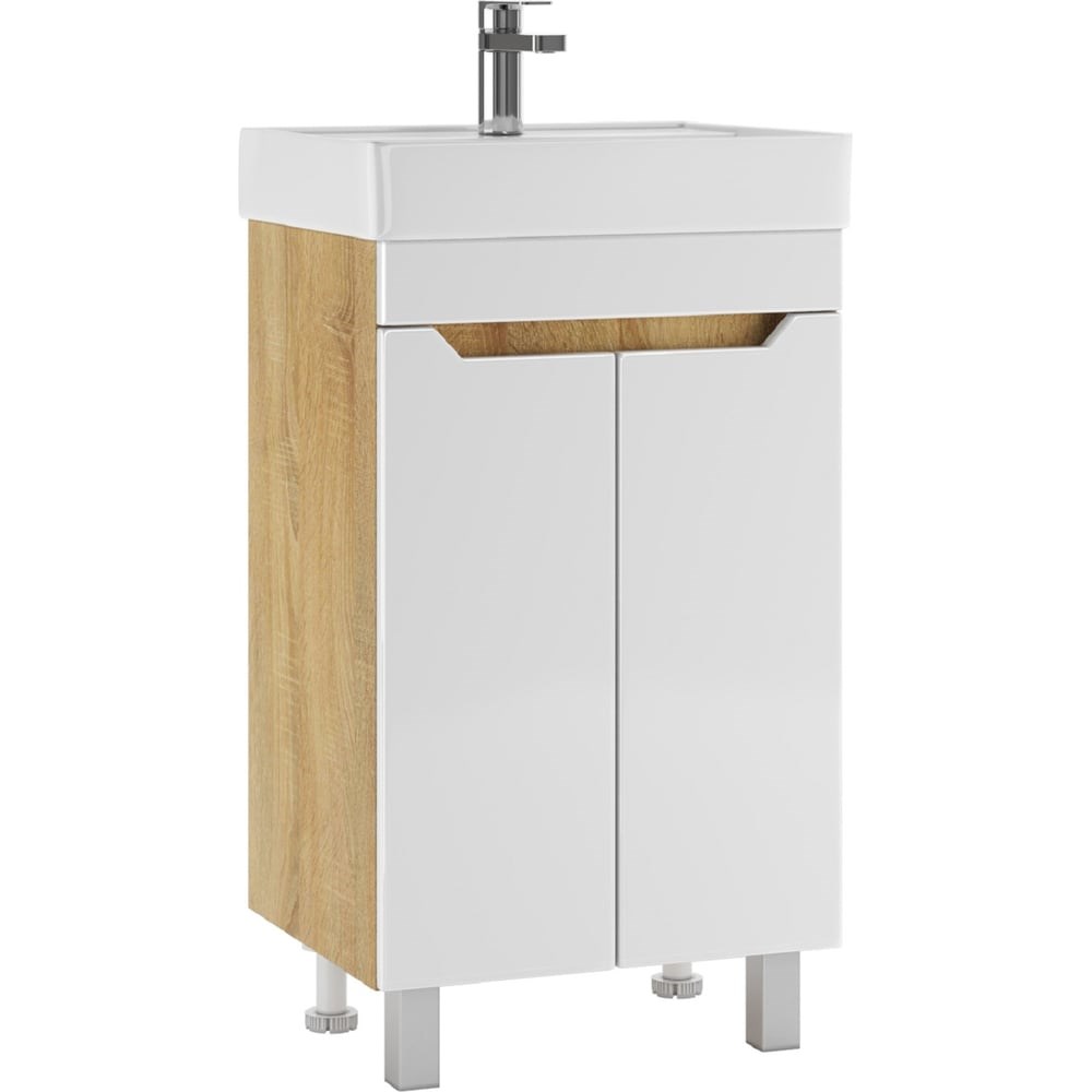 Тумба Айсберг Мечта под умывальник Енисей 50 без ящика, Дуб сонома DM2312T предназначена для компактных санузлов. Корпус изготовлен из ЛДСП, а фасад из ЛМДФ, покрыт пленкой ПВХ. Для удобства в использовании на дверцах установлены петли с доводчиком. Предусмотрена регулировка ножек до 30 мм. Тумба поставляется в собранном виде. Изделие обладает повышенной влагостойкостью и сопротивляемостью к внешним воздействиям, не выделяет вредных испарений в воздух, хорошо выдерживает воздействия бытовых химических веществ.