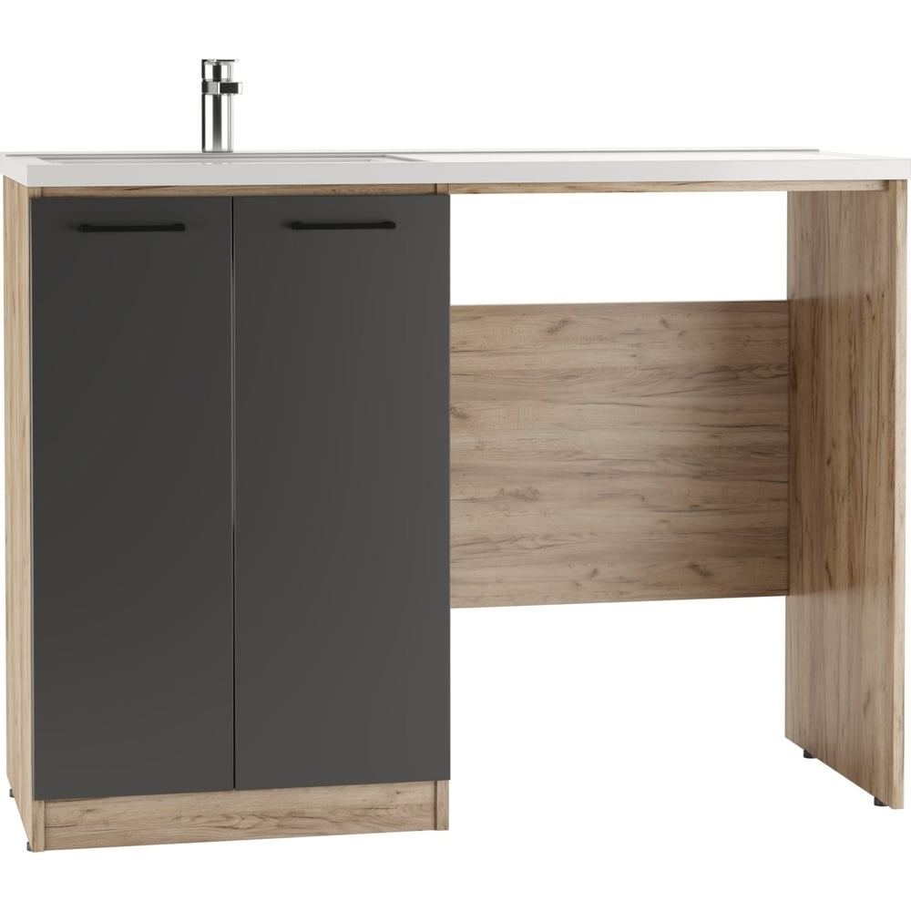 Тумба Домино Craft под умывальник Космос 120 левый/правый, с корзиной DCr2214Tс эксклюзивным дизайном подойдет для лаконичных и элегантных дизайнов ванной комнаты.Корпус представлен в цвете «Дуб вотан» и выполнен из ЛДСП. Фасад из ЛДСП, покрыт пленкой ПВХ, цвета графит. Фурнитура черного цвета.Возможна регулировка ножек до 30 мм.Для удобства использования на дверцах установлены петли с доводчиками.Изделие обладает повышенной влагостойкостью и сопротивляемостью к внешним воздействиям, не выделяет вредных испарений в воздух, хорошо выдерживает воздействия бытовых химических веществ.Поставляется в собранном виде. 2 года гарантия производителя.