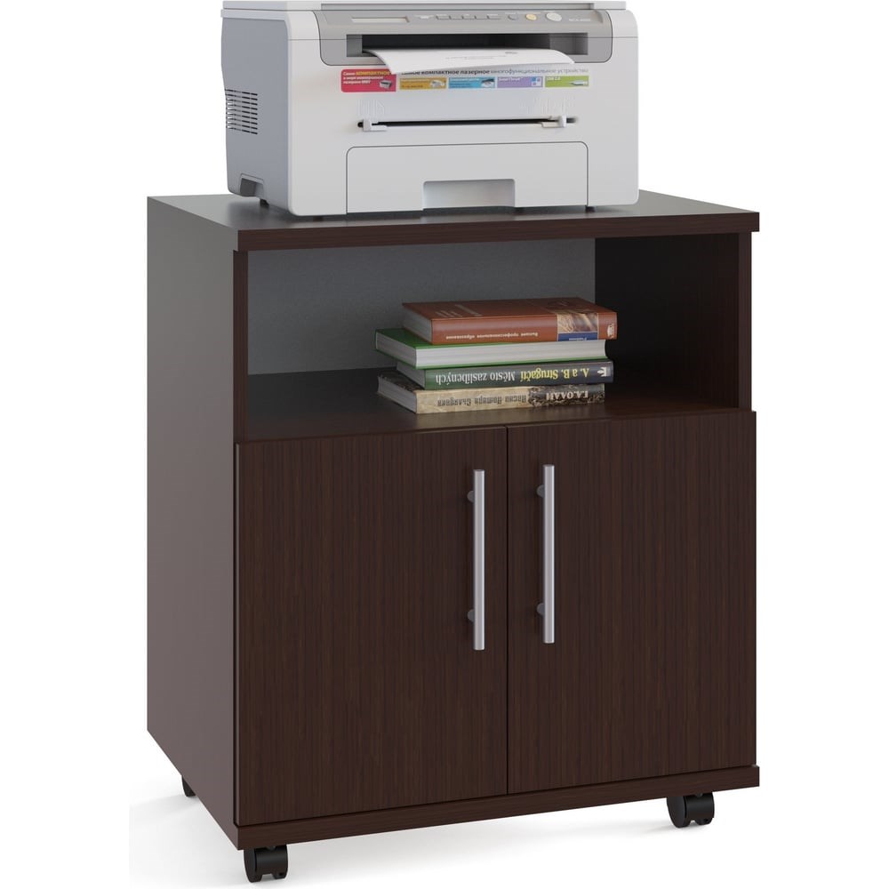 Тумба СОКОЛ венге КТ-11 КТ11В5 под офисную технику. Служит для меблировки рабочего кабинета или конференц-зоны. Размеры (ВхШхГ): 694 х 600 х 446 мм. Тумба имеет открытую нишу и закрытый шкафчик с полкой. Оборудована колесиками для удобного перемещения по комнате. Изготавливается из ЛДСП толщиной 22 и 16 мм, края обработаны кромкой ПВХ 2 и 0,4 мм. Ручки-рейлинги выполнены из металла. Расстояние между креплениями ручек — 128 мм. Обратите внимание! Задние стенки тумбы сделаны из ДВП серого цвета. Максимальная нагрузка на тумбу составляет 50 кг.