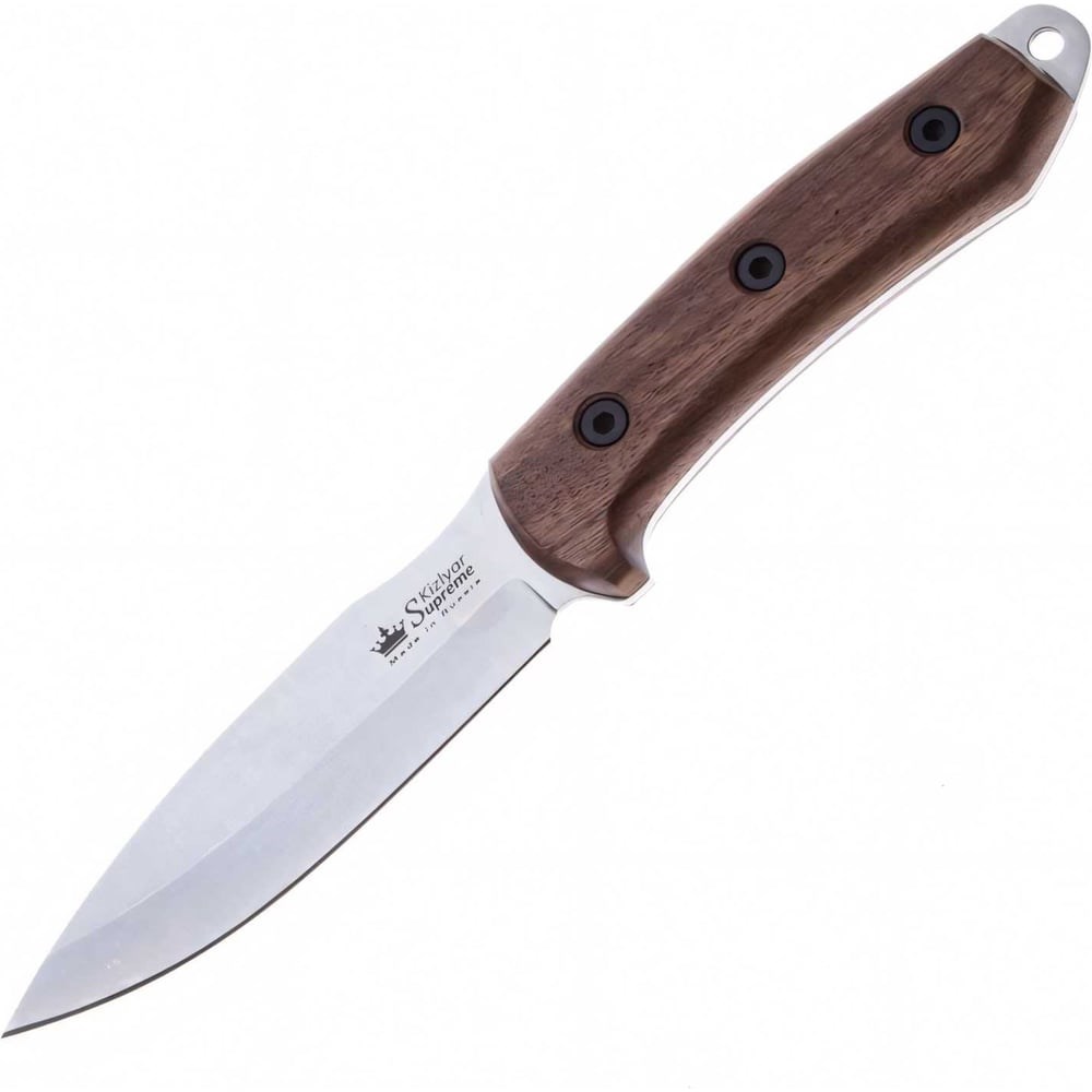 Туристический нож Kizlyar Supreme Corsair 4650065056977 можно взять с собой в лес или на рыбалку. Очень удобен и легок. Небольшая толщина клинка 2.4 мм вместе с бритвенными спусками дает прекрасный рез. При такой толщине, нож не является холодным оружием, что позволило конструкторам обеспечить его рукоять максимально удобным упором. Не случайно была выбрана и нержавеющая сталь AUS-8: закалка в азоте дает ей повышенную вязкость, при том, что клинок отлично держит заточку. Кожаные ножны со свободным подвесом абсолютно не стесняют движений и плотно удерживают нож.
