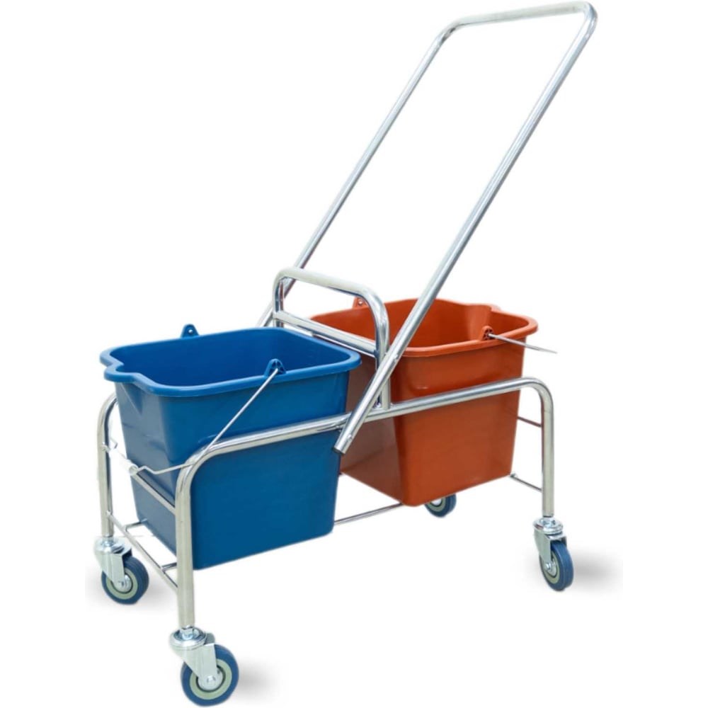 Тележка уборочная двуведерная, предназначена для уборки и мойки полов, перемещения моющих растворов и клининговых принадлежностей. Рама металлическая, крашенная, серого цвета. В ведрах есть мерная шкала для удобства. Тележка с отжимом оснащена удобными съемными ведрами вместимостью 16 литров, которые имеют ручку и носик для удобного слива воды. Поворотные колесики обеспечивают плавное и бесшумное передвижение по поверхности. Ручка для управления жёстко не закреплена и может перекидываться и фиксироваться с обеих сторон уборочной тележки. Тележка уборочная используется для профессиональной и домашней уборки, является основным уборочным инвентарем в клининговых компаниях. Уборочное ведро на колесах для уборки помещений - незаменимый помощник в поддержании чистоты и порядка в офисах, ресторанах и других коммерческих или общественных помещениях.