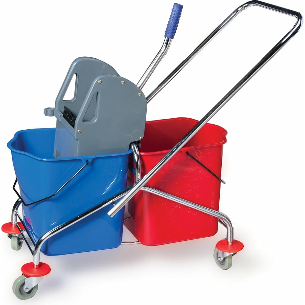 Уборочная тележка BRABIX предназначена для проведения влажной уборки в офисных и производственных помещениях с большой площадью. Представляет собой металлический каркас с установленными на него механическим отжимом для петельных тряпок и МОПов и 2 съемными ведрами по 25 л (рекомендованный объем каждого ведра - 20 л). База изготовлена из качественного пластика и металла, а инвентарь - из пластика. Тележка выполнена в трехцветном исполнении: красный, синий и серый. Колеса позволяют перемещаться в произвольном направлении. Имеются защитные диски на колесах.