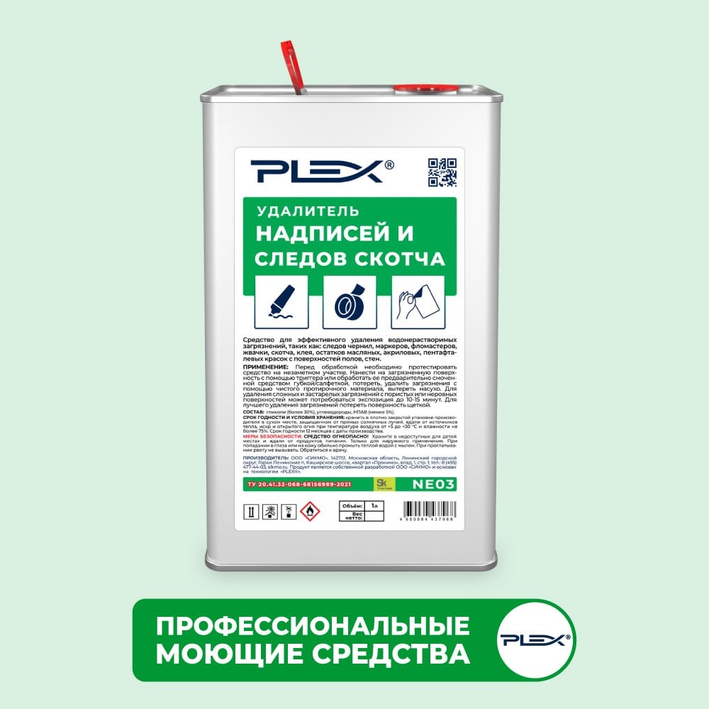 Удалитель надписей и следов скотча PLEX 1 л УТ000005712 Средство для эффективного удаления водонерастворимых загрязнений, таких как: следов чернил, маркеров, фломастеров, жвачки, скотча, клея, полос обуви, резины, остатков масляных, акриловых, пентафталевых красок с поверхностей полов, стен. Способ применения: Перед обработкой необходимо протестировать средство на незаметном участке. Нанести на загрязненную поверхность с помощью триггера или обработать ее предварительно смоченной средством губкой/салфеткой, потереть, удалить загрязнения с помощью чистого протирочного материала, вытереть насухо. Для удаления сложных и застарелых загрязнений с пористых или неровных поверхностей может потребоваться экспозиция до 3 минут. Для лучшего удаления загрязнений потереть поверхность щеткой.Меры предосторожности: СРЕДСТВО ОГНЕОПАСНО! Храните вдали от источников искр, открытого огня, тепла и прямых солнечных лучей, в недоступных для детей местах и вдали от продуктов питания. Только для наружного применения. При попадании в глаза или на кожу обильно промыть теплой водой с мылом. При проглатывании рвоту не вызывать. Обратиться к врачу.