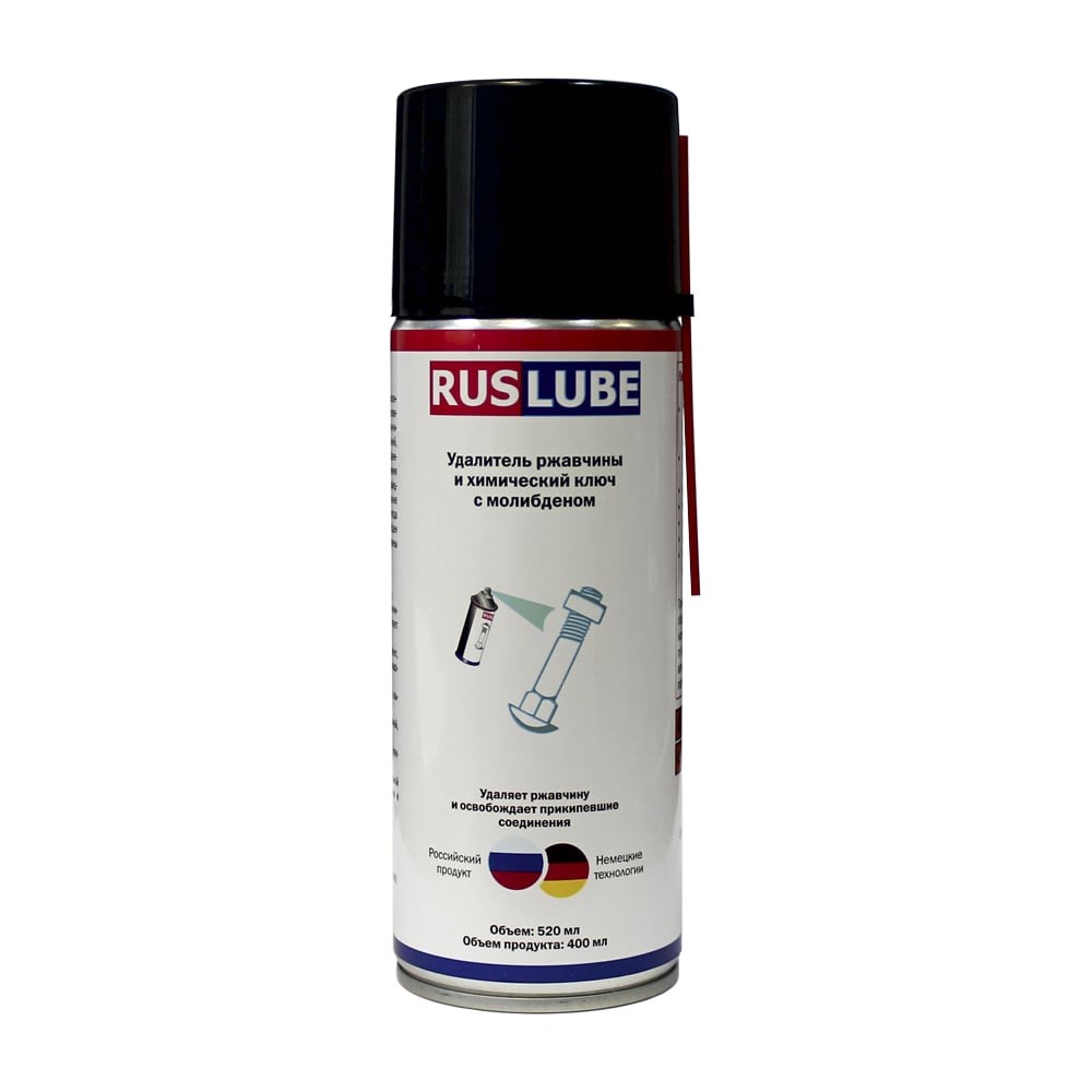 Удалитель ржавчины и химический ключ с молибденом Русмарк Ruslube 520/400 мл ruslube1006-1 для применения в промышленности при ремонте, демонтаже. Состав глубокого проникновения. Предназначен для облегчения отвинчивания заржавевших резьбовых соединений, смазывания трущихся поверхностей, устранения скрипов и заедания деталей, вытеснения влаги с различных деталей. Наличие дисульфидмолибдена (MoS2) гарантирует сохранение смазывающей способности в ситуациях, когда сама смазка уже истощена. Дисульфидмолибдена обеспечивает смазывание до момента замены или добавления смазочного материала Основные функции быстро размягчает и растворяет ржавчину дисульфид молибдена в составе дополнительно снижает трение и способствует легкости демонтажа обеспечивает долговременный эффект, продолжая работать при повторном использовании обработанных деталей обладает антикоррозионным действием, вытесняет влагу устойчив к воздействию кислот, щелочей, атмосферных влияний не содержит силикона, хлорированных углеводородов аэрозольный баллон снабжен и удлинительной трубочкой для удобства использования и точного нанесения.
