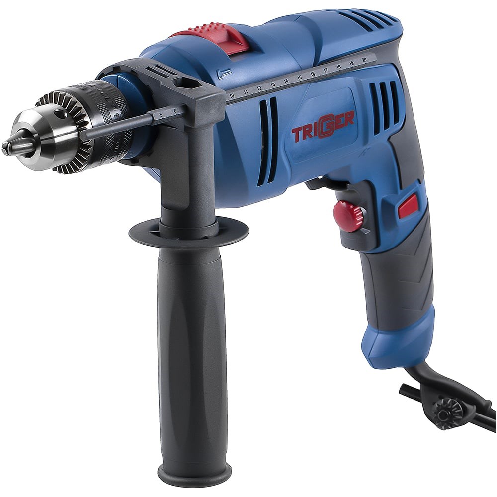 Дрель ударная сетевая Trigger 20012 —мощная дрель с ударной способностью легкого перфоратора. Предназначена для работ с деревом, металлом, пластиком, керамикой, кирпичом, камнем и бетоном.Режим удара применяется при сверлении бетона и кирпича, особенно удобен при работе с риском скалывания материала: углах, рядом с кромкой.Технические параметры:Номинальная потребляемая мощность 900 ВтЧисло ударов 44800 уд/минЭнергия удара 1,4 ДжЧастота вращения на холостом ходу 0-2800 об/минПатрон 13 мм, ключевой, стальнойМаксимальный диаметр отверстий:-бетон 18 мм-сталь 13 мм-дерево 35 ммКласс нагревостойкости электрической изоляции 200Материал щеткодержателя латуньМатериал корпуса нейлонШнур 3 м, резиновый морозостойкийВес изделия 2,4 кг