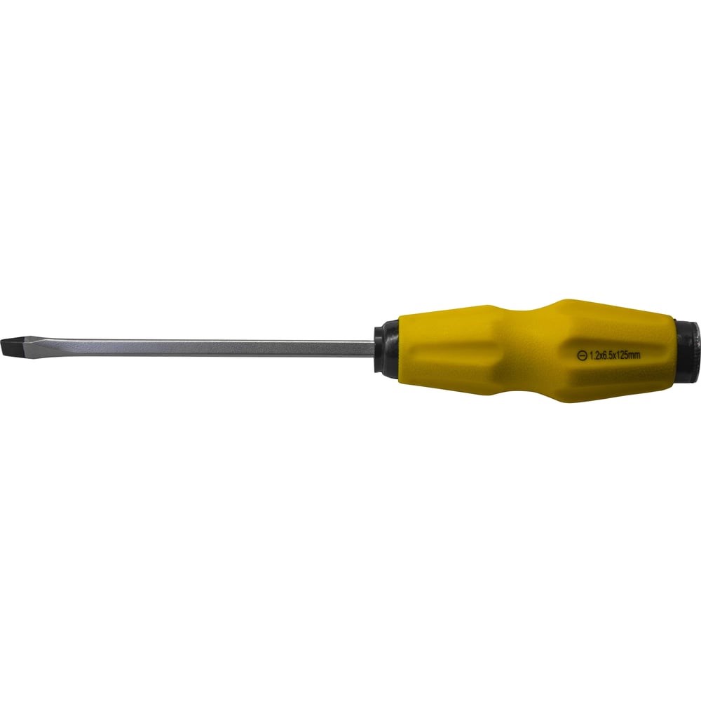 Ударная отвертка Промлайн 1,2x6,5x125 ПЛ014040265125_z022 применяется для монтажных и демонтажных работ с поврежденным, туго прикрученным, прикипевшим резьбовым крепежом. При помощи ударного инструмента наносятся удары по стальной шляпке, которой оснащена отвертка. Профиль — SL.