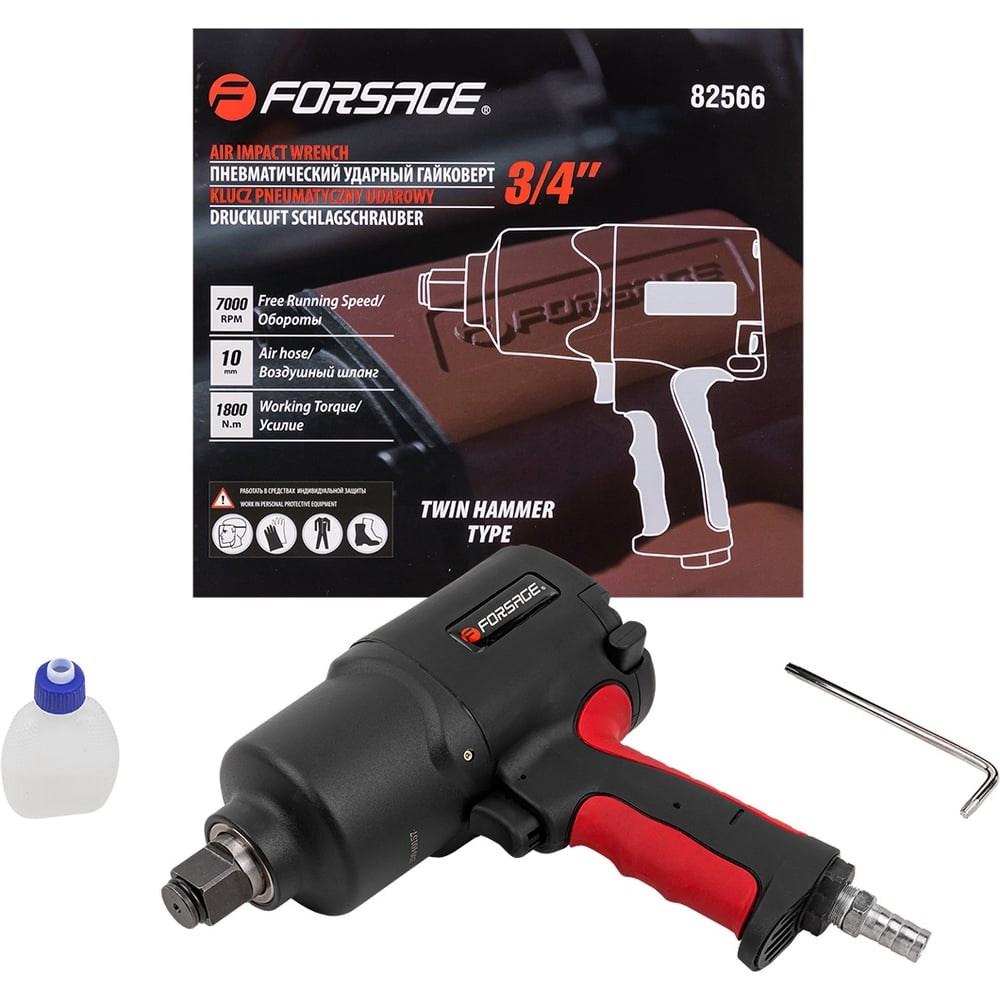 Пневмогайковерт ударный 3/4" от бренда Forsage в облегченном корпусе с реверсом и регулировкой усилия.Пневматический гайковерт предназначен для использования в сборочных цехах предприятий и на станциях технического обслуживания автомобилей, а также может с успехом применяться в условиях домашней автомастерской.Пневмогайковерт ударный "Twin Hammer" облегчает и ускоряет операции, связанные со сборкой и разборкой различного вида резьбовых соединений в процессе монтажных и демонтажных работ.Продуманность конструкции. Облегченный корпус инструмента позволяет применять его в условиях ограниченного рабочего пространства, а прорезиненная профильная рукоятка гарантирует комфорт при работе с инструментом.Удобство использования. Высокоэффективный механизм Twin Hammer обеспечивает мощь двойного удара. Он имеет небольшие размеры - это удобно при применении в разных условиях эксплуатации. Ударный механизм обеспечивает высокую производительность.Универсальность. Ударный пневмогайковерт Forsage Twin Hammer используется при работе в ремонтных мастерских, автосервисах, производственных цехах.