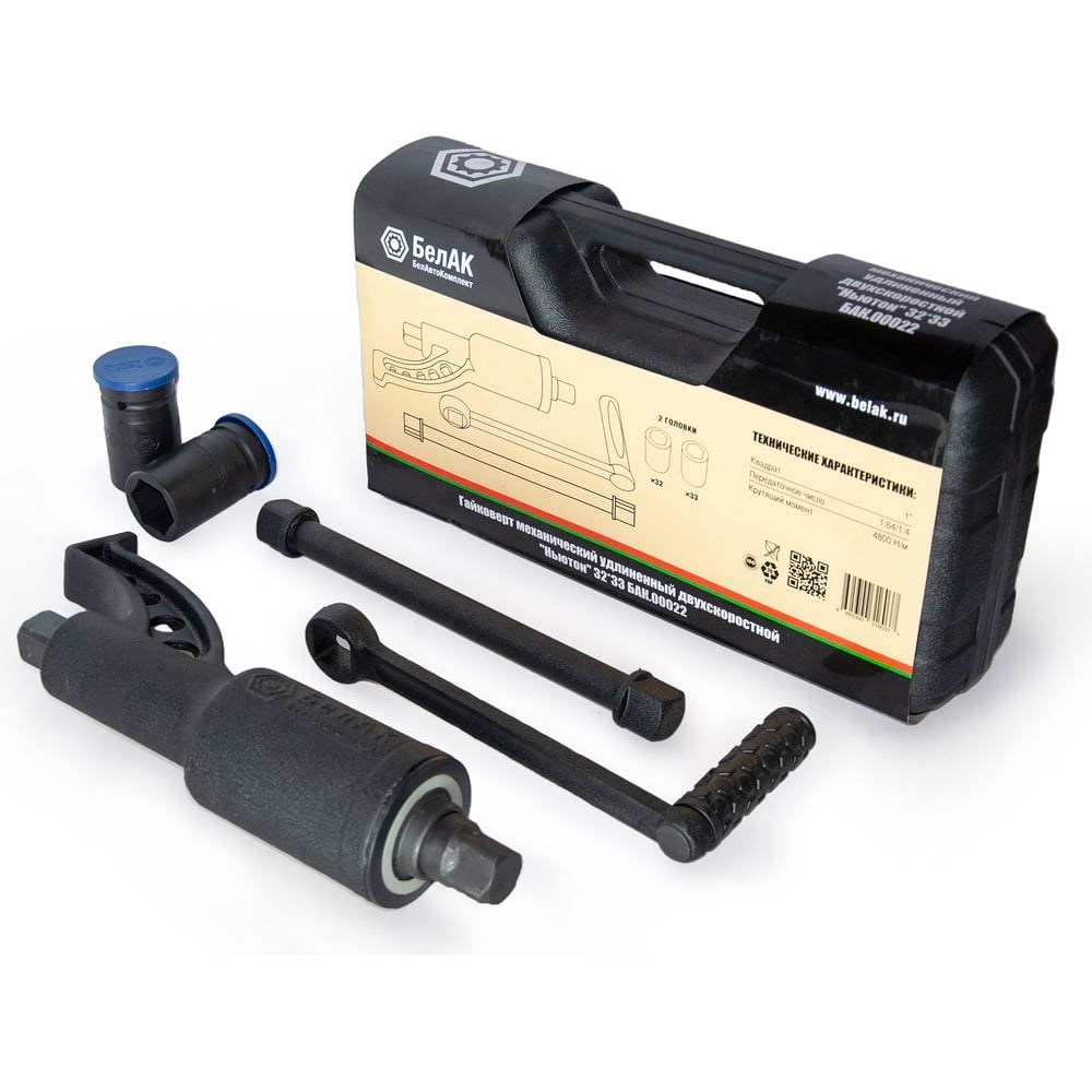 Гайковерт БелАК НЬЮТОН 32x33 мм 2х-скоростной удлиненный БАК.00022 выполнен из высокопрочных материалов, отличается повышенной надежностью и продолжительным сроком службы. Усиление крутящего момента осуществляется за счет планетарного трёхступенчатого редуктора. Фирменный логотип на корпусе, выполненный на этапе отливки, защищает от подделок и является гарантом оригинальности изделия. Служит для закручивания/откручивания тяжело нагруженных болтов и гаек при проведении шиномонтажных работ на грузовых автомобилях. Передаточное число: 1:64, то есть приложенное усилие будет увеличено в 64 раз. Эта модель гайковерта «БелАК» с двумя скоростными режимами обеспечивает эффективное усиление крутящего момента (до 64 раз) для удобного откручивания прочных соединений при минимальной нагрузке на руки. Переключатель скорости вращения применяется для изменения значения передаточного числа усилителя крутящего момента. Смена режимов работы осуществляется посредством вытягивания наружу или вдавливания внутрь переключателя. В положении «низкая скорость» развивается максимальное значение крутящего момента, значение передаточного числа составляет 1:64. Применяется для срыва и окончательной затяжки колесных гаек. В положении «максимальная скорость» передаточное число составляет 1:4. Применяется для предварительного закручивания гаек пред окончательной затяжкой или для быстрого откручивания. В механизме редуктора гайковерта использованы подшипники, а не втулки скольжения, как у аналогов. Все головки для гайковертов «БелАК» являются ударными. В комплект входит надежный морозостойкий и ударопрочный кейс, который обеспечит удобное и безопасное хранение инструмента.