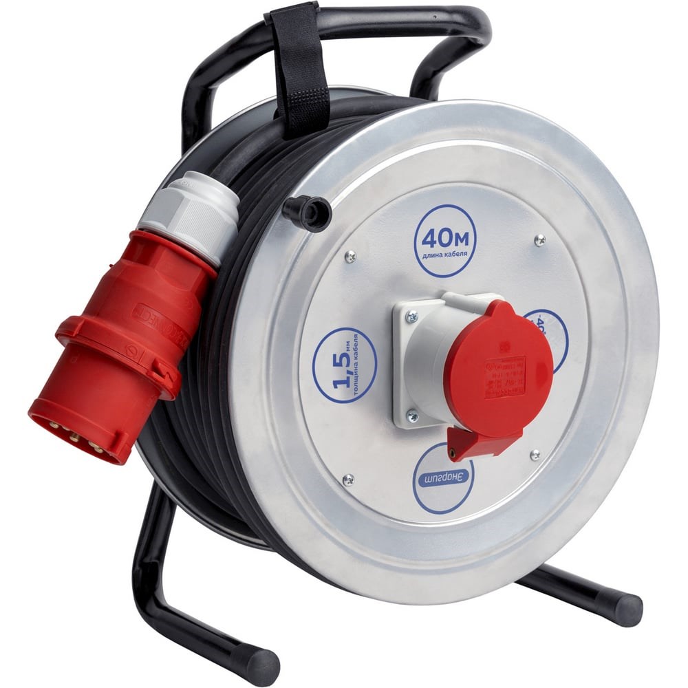 Удлинитель на катушке энаргит 380 Вольт, модель МК1, кабель гибкий КГтп-ХЛ 5х1,5, длина 40 метров, 1 розетка, степень защиты ip 44, арт. МК1-515-40К-3801-44 используется на строительных, производственных и судостроительных площадках. Корпус металлической катушки покрыт электроизоляционным (диэлектрическим) антикоррозийным порошковым покрытием. Конструкция рамы выполнена из прочной металлической трубы d - 19мм. В зависимости от установленной степени защиты возможно использовать в помещениях с повышенным уровнем влажности. Промышленные силовые разъемы от ведущих мировых производителей, гарантирующие безопасность и надежность.