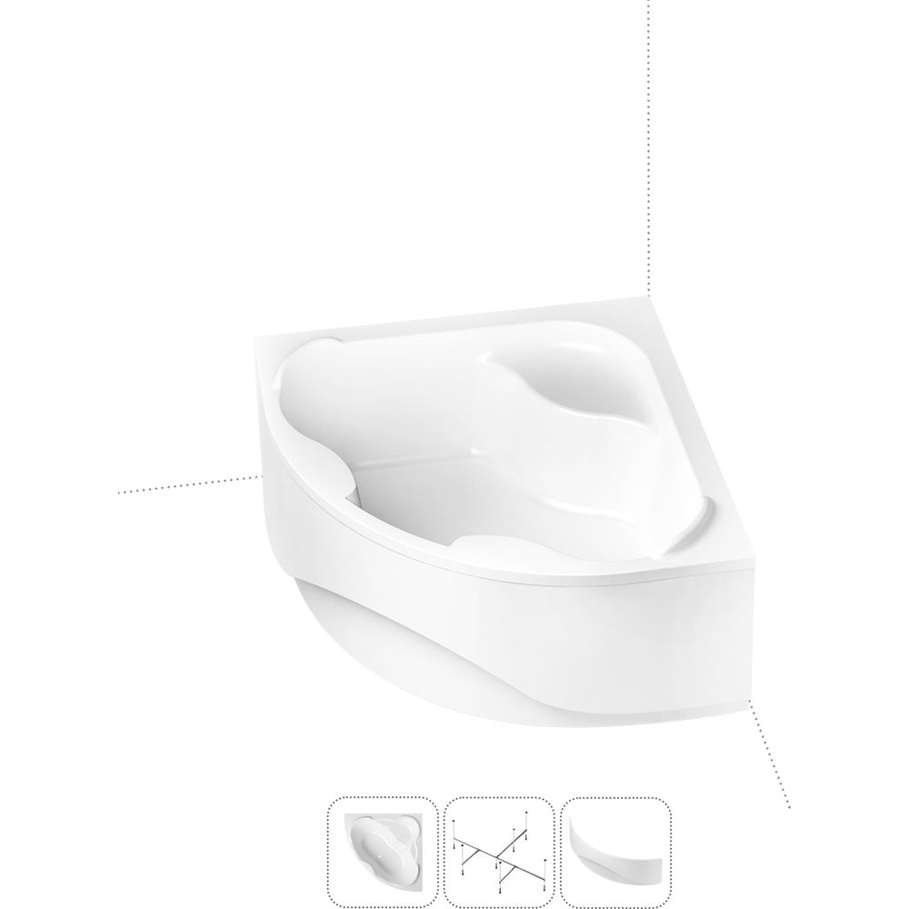 Симметричная угловая ванна Aveo производится в размерах 140140 и 150150 см, что позволит выбрать желаемый объем купели и эффективно использовать пространство ванной комнаты. Эргономичная чаша с совершенными формами отличается внушительным объемом (240 или 300 л в зависимости от размера). Удобные пологие спинки и смещенный в центр ванны слив позволяют максимально комфортно расположиться людям высокого роста и разного телосложения. На широких бортиках можно разместить часто используемые предметы гигиены и установить встраиваемый смеситель. Основа ванн из литьевого акрила — жесткий 4 мм лист полиметилметакрилата (ПММА), который помещают в вакуум-формовочное оборудование и под большим давлением заполняют матрицу будущей ванны. Для максимальной прочности конструкции по всему основанию купели закладывается усиленная плита ДСтП, а внешняя сторона покрывается смесью полимера с отвердителем и ровингом. После отверждения в ванне высверливают отверстия для слива-перелива. Конструкция ванны предполагает установку на поперечные ножки или усиленный металлический каркас с максимальной нагрузкой до 500 кг и предусматривает дополнительную фиксацию к стене. Наличие регулировок на каждой ножке и распорках обеспечивает удобство установки на различных поверхностях.