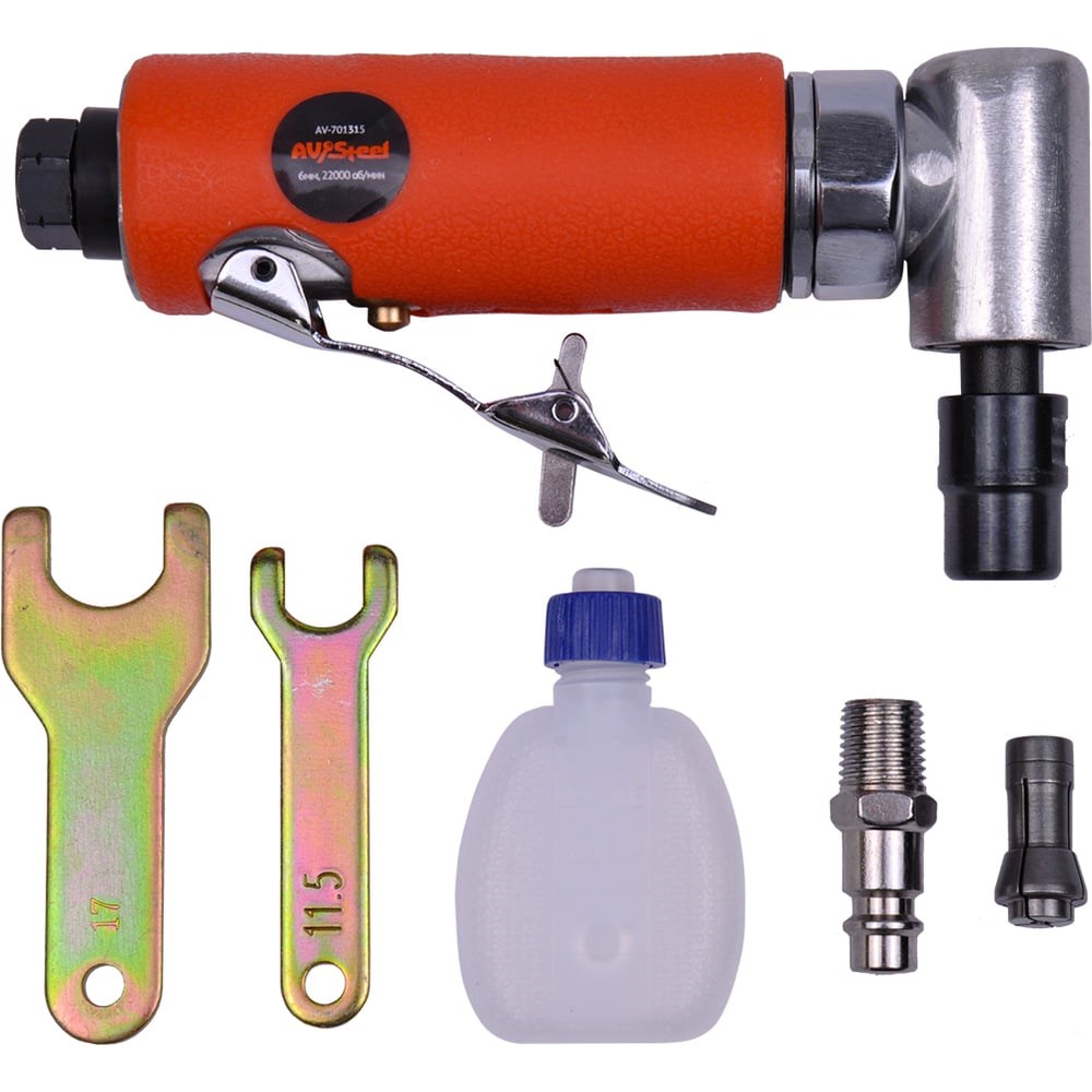 Угловая пневмобормашина AV Steel AV-701315 может использоваться для шлифовки, зачистки, фрезерования и гравирования. Оснащена цанговым патроном на 6 мм, в комплектации имеется цанговый патрон на 4 мм. Благодаря используемому редуктору позволяет работать в труднодоступных местах. Высокая скорость вращения, до 22000 об/мин, позволяет добиться высокого качества шлифования требуемой поверхности. Вращательный момент, создающийся пневмотурбиной, дает ряд достоинств: высокий ресурс, отсутствие перегрева, устойчивость к перегрузкам, возможность работать длительное время, а также высокую пожаробезопасность. Рекомендуется использовать подключение шлангом со внутренним диаметром не менее 8 мм.