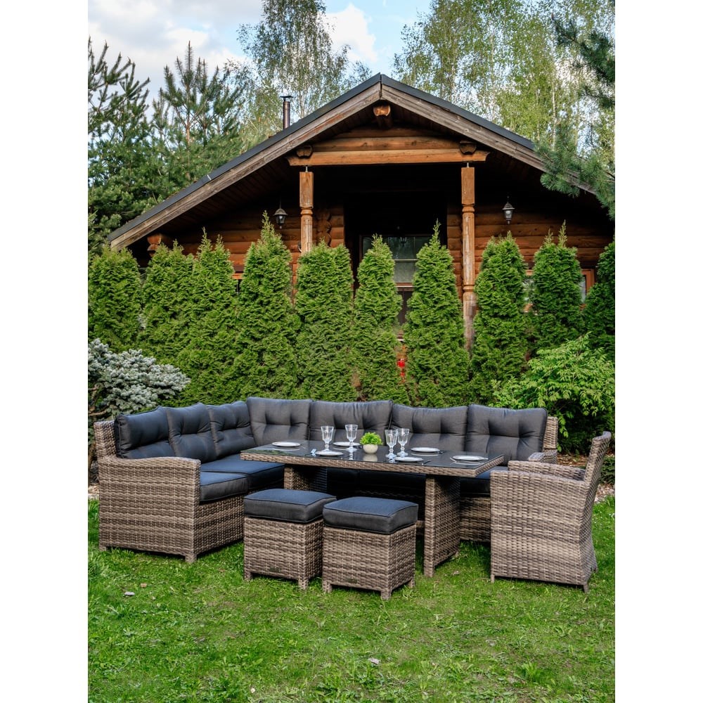 Угловой комплект уличной мебели Genry станет отличным решением для всех, кто предпочитает полноценный летний досуг на территории придомового участка. Ключевая особенность набора заключается в его габаритах, которые обеспечивают возможность его применения не только для семейного досуга или трапез, но и времяпровождения в большой компании друзей. Genry – уличная мебель для каждой дачиОн подходит для установки на террасе или веранде, в летней беседке или под открытым небом в тени приусадебного сада. В комплект входят:вместительный угловой диван, за которым комфортно разместится компания из 6-7 человек;кресло с высокой спинкой и подлокотниками;большой обеденный стол со столешницей из закаленного стекла.Также набор дополнен двумя пуфами и мягкими подушками-сидениями, чехлы для которых изготовлены из водоотталкивающей ткани. Дачная мебель Genry на долгие годыКомплект мебели Genry изготовлен на основе каркаса из легкого, но в то же время прочного алюминиевого каркаса, способного выдерживать весовые нагрузки до 200 килограмм без риска деформации или расшатывания предметов. Что касается декоративной отделки, то она выполнена посредством плотного плетения нитей из искусственного ротанга. Данный синтетический материал отлично противостоит контактам с водой, поэтому накрывать мебель чехлами во время дождя вовсе не нужно. Кроме того, техноротанг не выгорает на солнце и не теряет своих качеств при частых и резких сменах температурного режима.