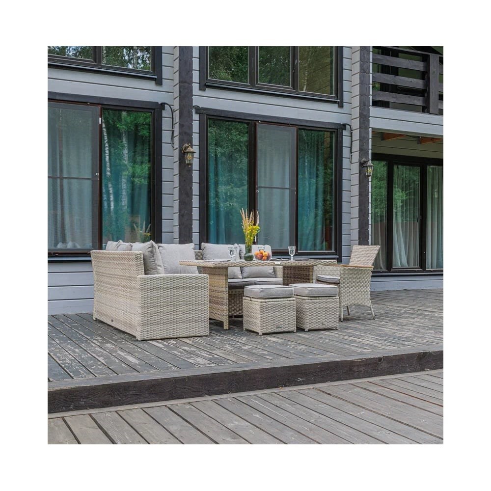 Комплектация и габариты:Диван прямой - 171x71x81 смДиван угловой- 183x71x81 смКресло - 60х59х87 смОбеденный стол - 150x90x70 смПуф (2 шт.) - 40x40x33 смПодушки под спину (7 шт.) - 53х48х22 смПодушки для сиденья (6 шт.) - 60х10х56 смПодушки для сиденья на кресло (1 шт.) 47х7х44 смПодушка для сиденья на пуф (2 шт.) - 40х10х40 смМатериалы:Материал комплекта - искусственный ротанг (ручного плетения)Материал каркаса – сталь, окрашенная порошковым методомМатериал столешницы - закаленное стеклоМатериал подлокотников кресла - поливуд (искуссвенное дерево)Материал чехла на подушки - олефин (водоотталкивающая ткань)Материал наполнителя подушек под спину - синтетический пухМатериал наполнителя подушек для сидения - поролонЦвет комплекта - бежевыйЦвет подушек - бежевыйДополнительная информация:Количество посадочных мест – 8-10 человекМаксимальная нагрузка на посадочное место - 150 кгЧехлы съемные - даТемпературный режим - от -50C до +50CСочетается с комплектами бренда ROYAL FAMILY в бежевом цветеНакладки на ножки - да (пластиковые)Категория ротанга - первичнаяДержатели и крепления подушек зависят от поставки и не являются неотъемлемой частью комплекта