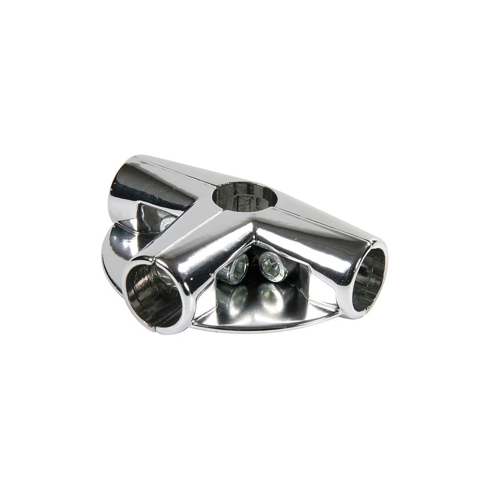 Угловой крепеж MFK-TORG с 4 направлениями, с 2 полкодержателями UNO-9.25 П подходит для соединения труб диаметром 25 мм. Данный крепёж соединяет 4 трубы, одна из труб по центру проходит насквозь и 3 другие по бокам под углом 90 градусов. Используется для создания разнообразных витрин и прочего торгового оборудования с использованием труб 25 мм.