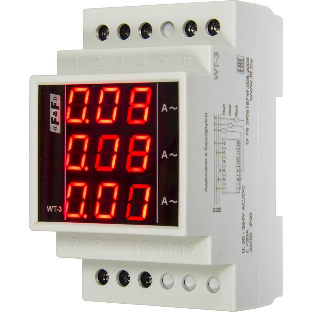 Указатель тока для трехфазной сети F&F WT-3 EA04.008.006 применяется для измерения силы тока трехфазной сети. Его величина отображается на 3-х разрядном светодиодном табло. Отображение параметров осуществляется отдельно на каждой из трех фаз. Прибор питается от напряжения любой из измеряемых фаз. Монтаж производится на DIN-рейку 35 мм.