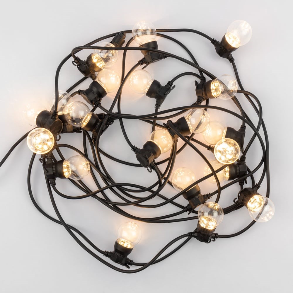 Уличная гирлянда «Лофт» выполнена на основе гирлянды «Белт-Лайт» и представляет собой готовый к использованию комплект с уже установленными в патроны прозрачными светодиодными лампами.Выполнена из электрического провода длиной 10 метров, заключенного в изоляционную оболочку из морозостойкого, гибкого, прочного каучука черного цвета. Гирлянда имеет защиту по стандарту IP44 – не боится попадания водных брызг, поэтому подходит для размещения как дома, так и на улице.Диапазон рабочих температур –25...+40 °С.
