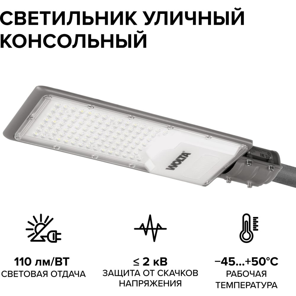 Уличный консольный светодиодный светильник Wolta 100Вт 11000лм 5700К Холодный свет IP65 STL-100W/04 серии STL-04 устанавливается на стандартную консольную трубу диаметром 50мм. Светодиодные уличные светильники торговой марки WOLTA® STL-04 с широкой осевой кривой силы света (КСС), широко применяются для освещения автомобильных дорог различных категорий, а также улиц, открытых территорий спортивного и производственного назначения, парков и прогулочных дорожек, придомовых территорий, площадей, автостоянок. STL-04 являются энергоэффективной заменой традиционных светильников ГКУ, РКУ и ЖКУ. Высокие светотехнические характеристики. Эффективность светильника -110лм/Вт. Цветовая температура 5700К. Это оборудование со степенью защиты IP65, позволяющие ему эффективно работать в условиях повышенной влажности и пыли. Заказать светодиодные светильники Вы можете в режиме онлайн. Наши менеджеры предоставят всю сопутствующую информацию о товаре. Светильник консольный STL-04: Эффективность светильника -110лм/Вт Цветовая температура - 5700К Ресурс 50 000 часов без существенной потери светотехнических параметров Корпус из стойкого к коррозии алюминиевого сплава Современный дизайн Простой способ монтажа и подключения Гарантия 2 года Компания WOLTA предоставляет гарантию на данные светильники - 2 года и сервис по замене товара. Мы гарантируем тройной контроль качества в собственной лаборатории.