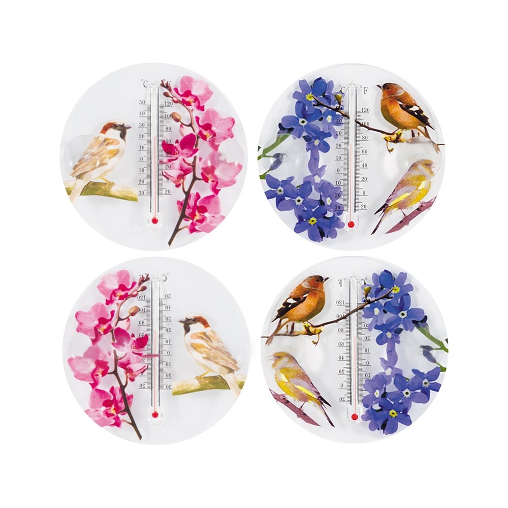 Уличный термометр Park Цветы и птицы, 2 варианта дизайна 000152 позволяет измерить температуру снаружи помещений. Выполнен из прочного пластика и оснащен присосками из ПВХ с левой и правой стороны. Керосин надежно запаян в стеклянную трубку. Теплопередающая печать на поверхности.