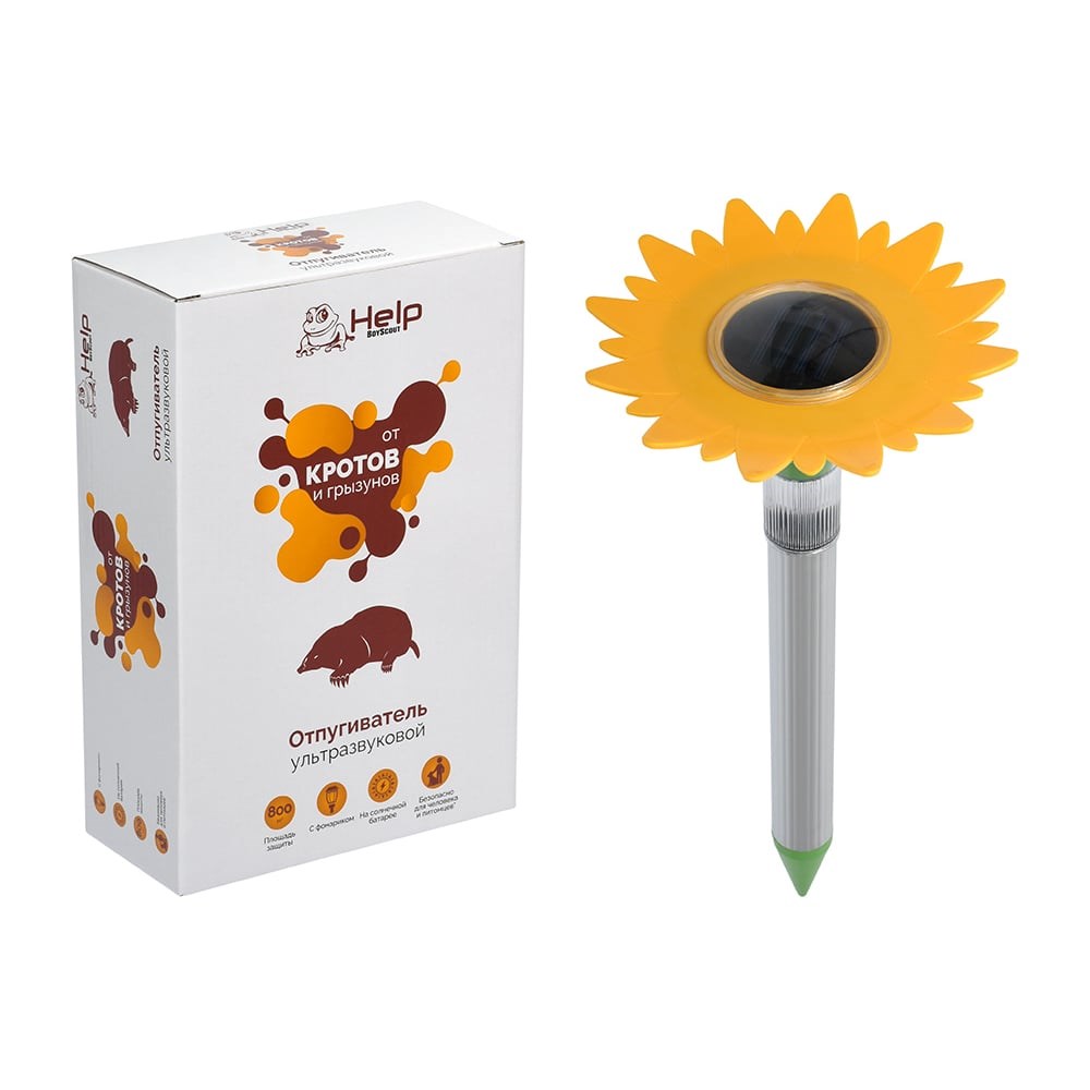 Ультразвуковой отпугиватель кротов с фонариком HELP 17x38 см 80411 используется для отпугивания кротов.Эффективное универсальное устройство для борьбы с кротами, полевыми мышами, землеройками и другими земляными вредителями.Встроенные солнечные батареи сами заряжают установленный в приборе аккумулятор, позволяя забыть о смене батареек.Отпугиватель, выполненный в форме подсолнуха, станет приятным украшением дачного участка.