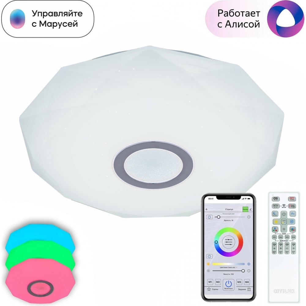 Светодиодная потолочная люстра Citilux Диамант Смарт CL713A30G с голосовым управлением является ярким представителем современных УМНЫХ хай-тек светильников экосистемы Citilux SMART. Выпускается с белым глянцевым плафоном с эффектом звездного неба и декоративным элементом в цвете хром. Светильник накладной, плоский. Крепление подходит для всех типов потолков, в том числе натяжных. Моделью можно управлять: из приложения на смартфоне по Wi-Fi при наличии интернета, с помощью голосовых помощников Алиса и Маруся, есть возможность запуска настроенных сценариев с помощью Сири, а также пультом дистанционного управления и с настенного выключателя. Модель оснащена мощными светодиодами холодного и теплого света, независимой цветной подсветкой RGB. Мощность светильника 35Вт, с диммером и функцией плавной регулировки.