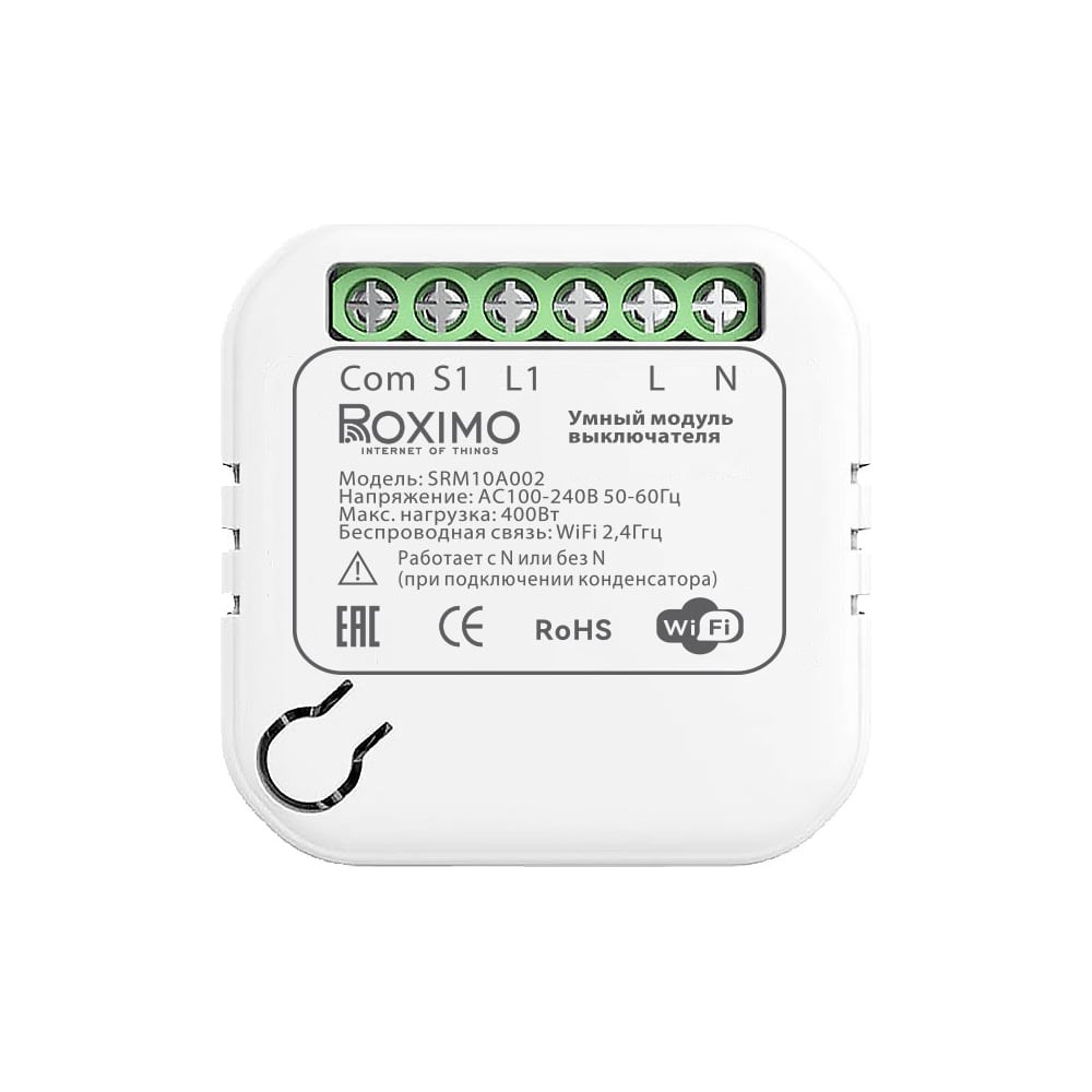 Умный модуль выключателя (реле) Roximo без ноля SRM10A002 с возможностью подключения без нулевой линии - это одно из устройств экосистемы умного дома Roximo. Устройством можно управлять с помощью специального приложения из любой точки планеты, добавлять умные сценарии и расписания включения/выключения по времени, обратному отсчету, а так же в зависимости от таких триггеров как погода, время заката и восхода солнца, вашего местоположения и т.д. Модуль имеет сверхкомпактный размер и устанавливается в стандартную установочную коробку (подрозетник), располагаясь за выключателем. Подключение можно выполнить одним из способов: с использованием обычного выключателя, проходных выключателей или без выключателя, т.е. использовать модуль как умное реле. Интеграция с популярными голосовыми помощниками и умными колонками: Google Assistant, Yandex Алиса, Маруся mail_ru, Сбер салют и др. - позволяет управлять умным устройством голосом без всяких дополнительных шлюзов.