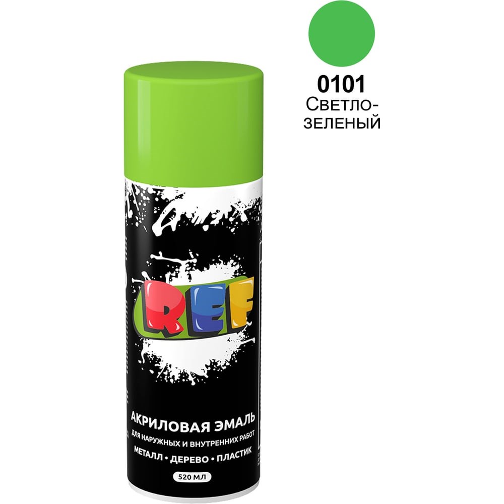 Акриловая универсальная эмаль REF светло-зеленый 520 мл 0101 предназначена для защитно-декоративного окрашивания различных поверхностей внутри и снаружи помещений. Продукт широко используют во время строительных работ, ремонта автомобилей и оформления интерьеров. Быстросохнущий состав отличается высокой укрывистостью и хорошей адгезией к большинству материалов (металл, дерево, пластик). Краска образует равномерное покрытие, устойчивое к механическим (удары, износ, царапины, изгибы) и неблагоприятным атмосферным (осадки, перепады температуры, ультрафиолет) воздействиям.