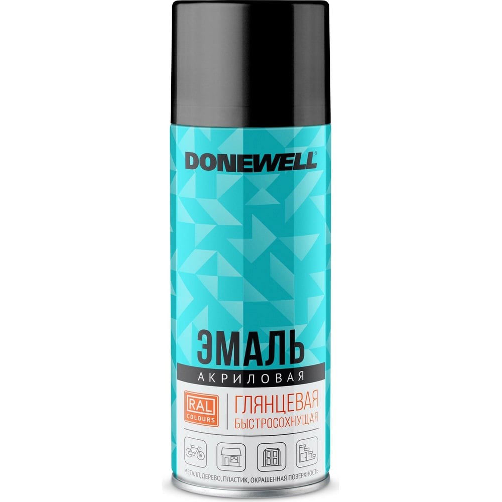 Эмаль универсальная акриловая DONEWELL RAL 9005 чёрная глянцевая DW-A9005 - быстросохнущая глянцевая эмаль DONEWELL® предназначена для окрашивания предварительно загрунтованных поверхностей (металлических, деревянных, бетонных, пластиковых и пр.). Рекомендуется для любых декоративных и оформительских работ. Легко наносится на труднодоступные места, имеет хорошую адгезию и укрывистость. Готовое покрытие обладает высокой атмосферостойкостью, твёрдостью и механической прочностью. Для наружных и внутренних работ. Цвет соответствует европейскому цветовому стандарту RAL.