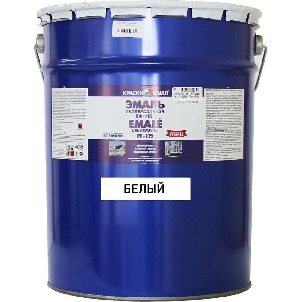 Эмаль Краски квил ПФ-115 Универсальная, белая, бар. 20 кг 4607023391816 предназначена для окрашивания металлических, деревянных, кирпичных, гипсовых, бетонных и других поверхностей эксплуатируемых в атмосферных условиях и внутри помещений. Состав содержит алкидный лак, пигменты, наполнители, органический растворитель, сиккатив, функциональные добавки. Покрытие обладает высоким глянцем и твердостью, устойчиво к воздействию воды, бытовых моющих средств и технических масел. Двухслойное покрытие эмали, нанесенное на подготовленную загрунтованную поверхность, в умеренном и холодном климате сохраняет защитные свойства в течение 4-х лет, декоративные - в течение 1 года.