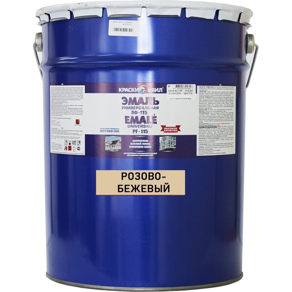 Эмаль Краски квил ПФ-115 Универсальная, розово-бежевая, бар. 20 кг 4607023391830 предназначена для окрашивания металлических, деревянных, кирпичных, гипсовых, бетонных и других поверхностей эксплуатируемых в атмосферных условиях и внутри помещений. Состав содержит алкидный лак, пигменты, наполнители, органический растворитель, сиккатив, функциональные добавки. Покрытие обладает высоким глянцем и твердостью, устойчиво к воздействию воды, бытовых моющих средств и технических масел. Двухслойное покрытие эмали, нанесенное на подготовленную загрунтованную поверхность, в умеренном и холодном климате сохраняет защитные свойства в течение 4-х лет, декоративные - в течение 1 года.