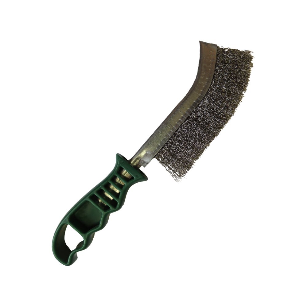 Ручные щетки предназначены для обработки изделий из черных сталей, нержавеющих сталей, цветных металлов и их сплавов, камня, бетона, дерева и других материалов. Материал корпуса: сталь Материал ручки: пластик Форма ручки: анатомическая Кол-во рядов ворса: 1 Длина корпуса L (мм): 265 Длина рабочая A (мм): 140 Ширина рабочая B, E (мм): 18 Материал ворса щетки: сталь нержавеющая Диаметр ворса (мм): 0,30 Тип (форма) ворса: гофрированный (волнистый) Длина ворса T, S (мм): 25