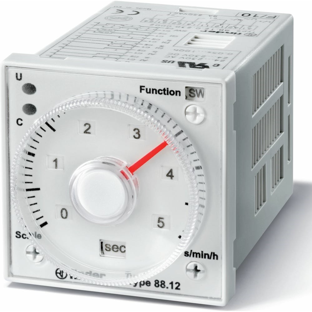 Дополнительные характеристики универсального многофункционального реле времени Finder для монт. на лицевую панель, 8 пин разъём, 881202300002: Номинальное напряжение катушки - 24-230 В. 8-штырьковый разъем. Установка на переднюю панель щита. Розетки 90 серии. Временные промежутки от 0.05 с до 100 ч. Функции: Al a: Задержка включения (2 контакта с задержкой), Al b: Задержка включения (1 контакт c задержкой + 1 контакт без задержки), Dl a: Интервалы (2 контакта с задержкой), Dl b: : Интервалы (1 контакт c задержкой + 1 контакт без задержки), GI: Импульсы с задержкой, SW: Симметричный повтор цикла (начал.импульс ВКЛ). Контактная группа - 2 CO (DPDT).