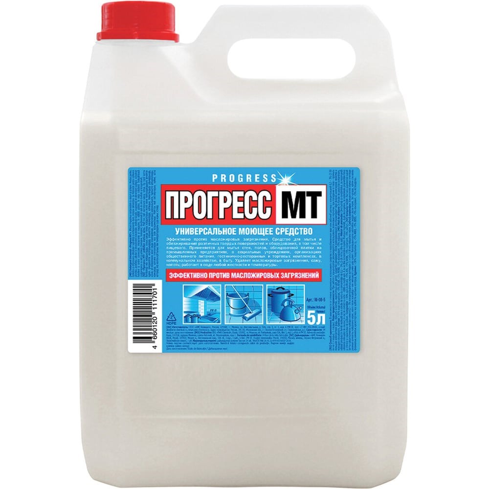 Универсальное моющее средство эффективно для мытья и обезжиривания различных поверхностей, оборудования, стен, полов, плитки в бытовых и производственных помещениях, а также против масложировых загрязнений.Концентрированное, слегка загущенное моющее средство с активными компонентами против жировых загрязнений животного, растительного, индустриального происхождения. Предназначено для мытья и обезжиривания посуды и различных твердых поверхностей (кафеля, сантехоборудования, пищевого оборудования, полов).Средство ПРОГРЕСС МТ эффективно против масложировых загрязнений, сажи, копоти. Формула разработана для эффективной работы как в горячей, так и в холодной воде любой жесткости, обеспечивая безупречный результат при любой температуре, при этом легко смывается и устраняет неприятные запахи.